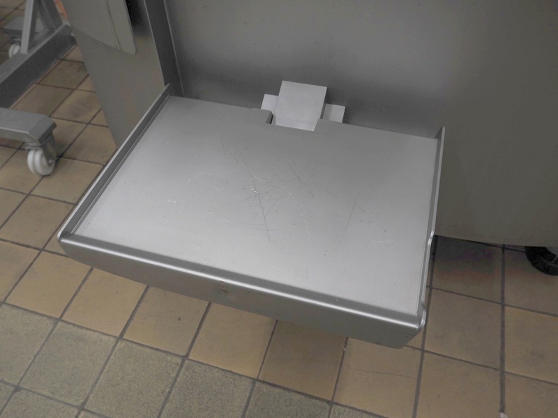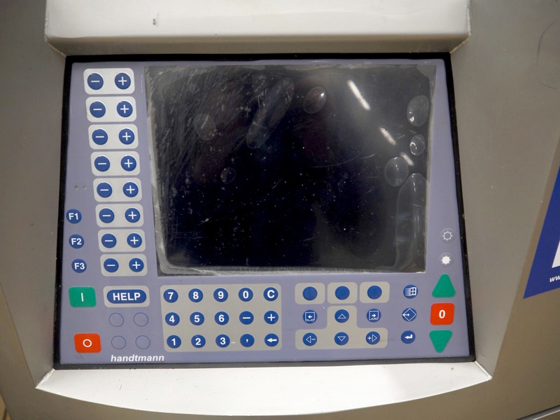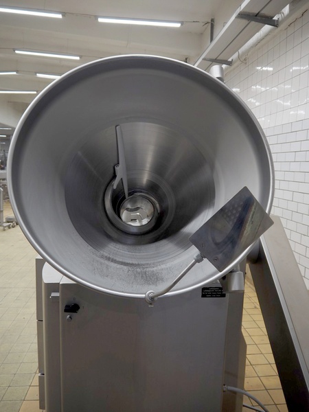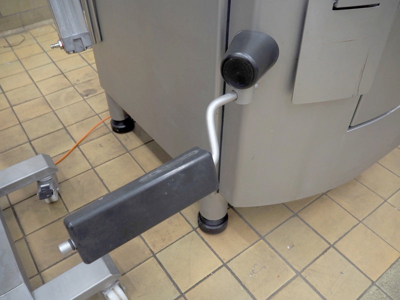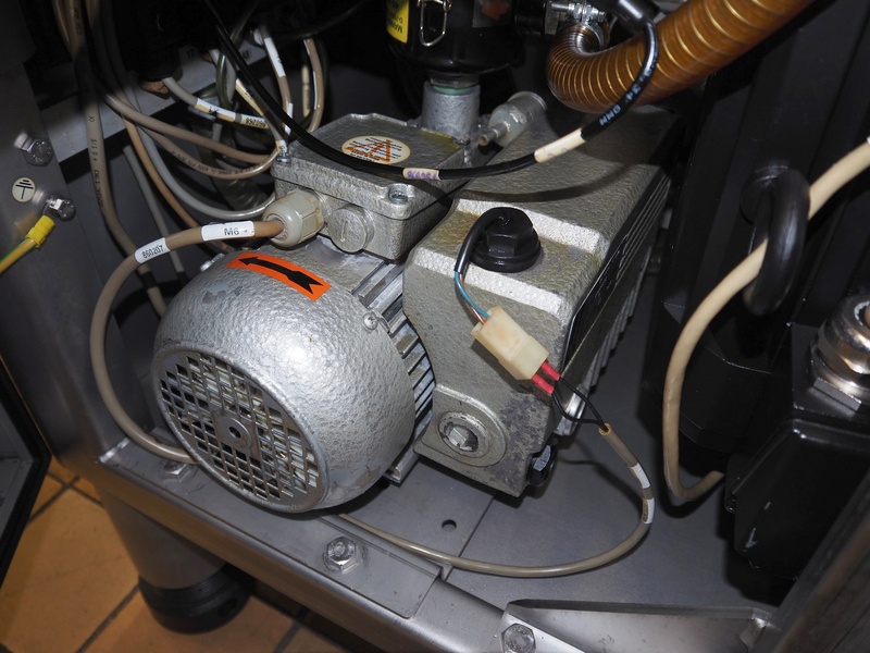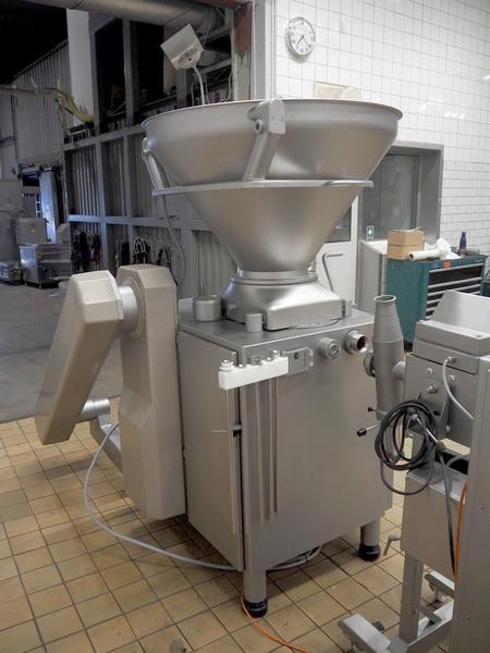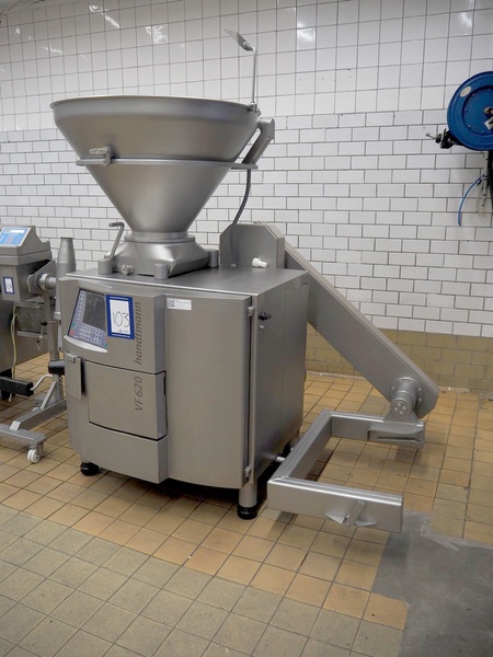 Handtmann vacuum filling machine with lifter for meat bins, type: VF620, number: 14646, year of construction: 2001, 400 V, 3 Ph, 50 Hz, 11.5 A, 8.0 kW, Busch vacuum pump, type: KB 0016, capacity: 16 m³ per hour, dimensions: 2130 mm x 1360 mm x 1950 mm.
