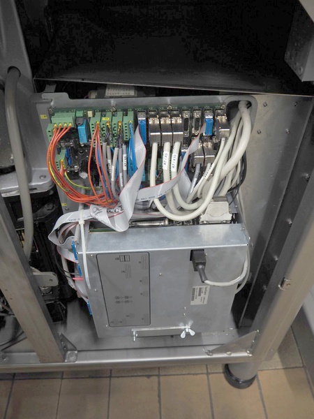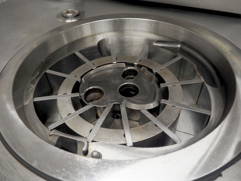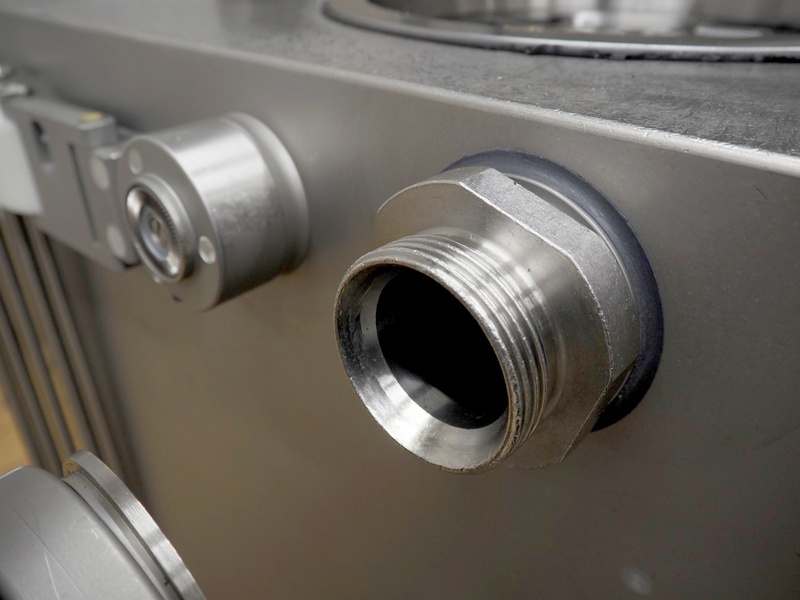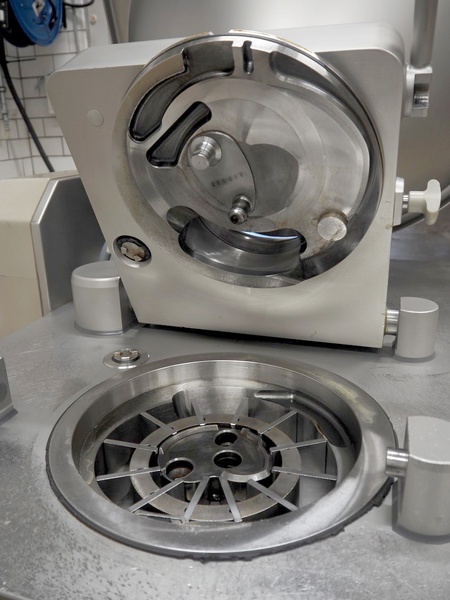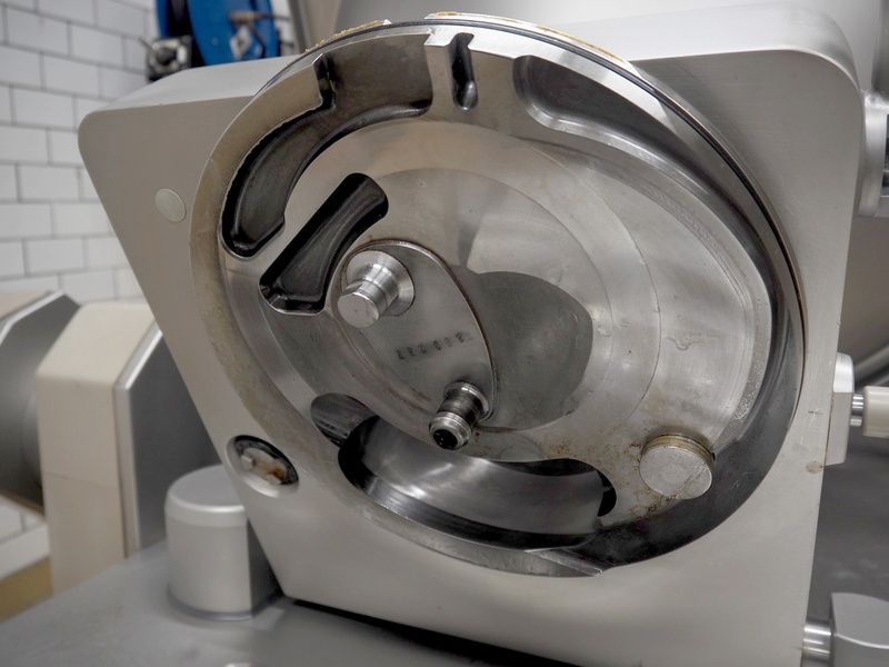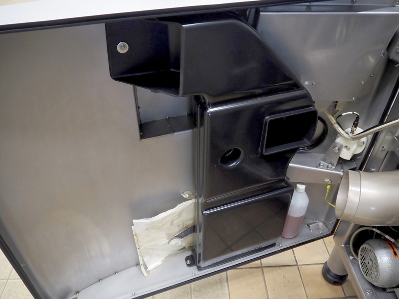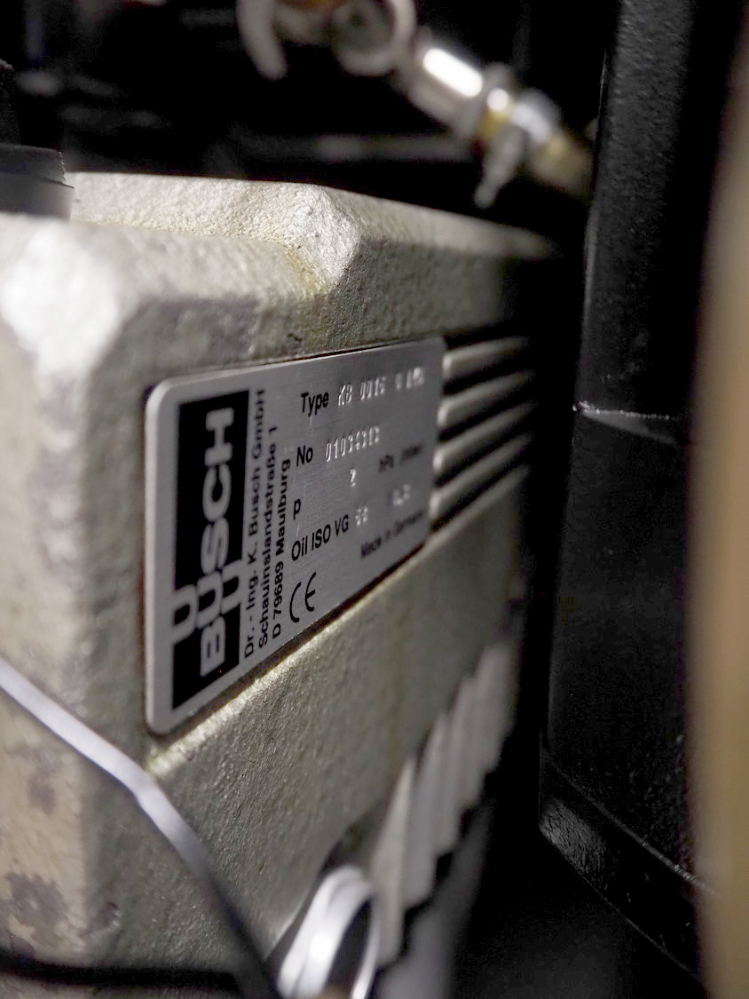 Handtmann vacuum filling machine with lifter for meat bins, type: VF620, number: 14646, year of construction: 2001, 400 V, 3 Ph, 50 Hz, 11.5 A, 8.0 kW, Busch vacuum pump, type: KB 0016, capacity: 16 m³ per hour, dimensions: 2130 mm x 1360 mm x 1950 mm.