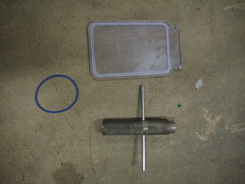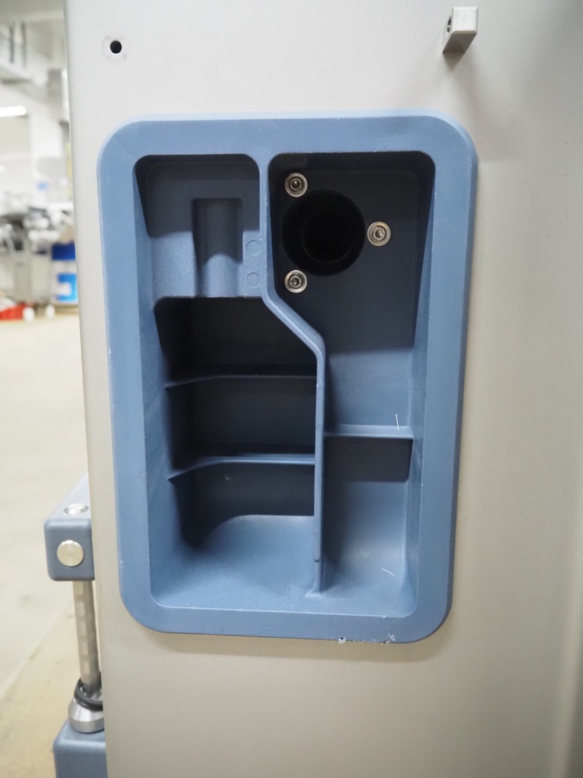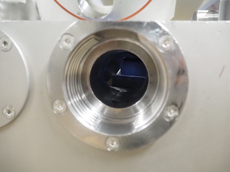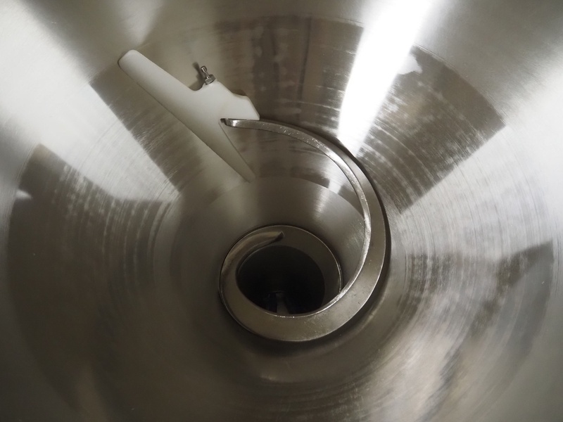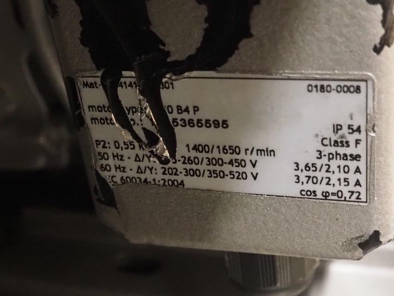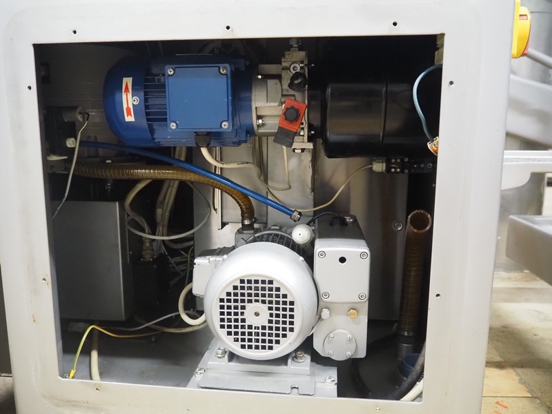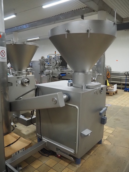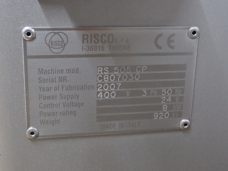 Risco S.P.A. vacuum filling machine with lifter for 200 liter meat bins, model: RS 505 CP, serial number: C807030, year of construction: 2007, 400 V, 3 Ph, 50 Hz, 8 kW, machine weight: 920 kg, dimensions: 1950 mm x 1270 mm x 2300 mm.