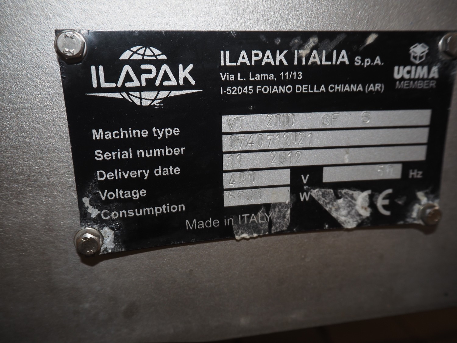 Ilapak vertical bag form-, fill- and seal machine, type: VT 2000 GF S, serial number: 0740712021, year of construction: 11-2012, 400 V, 50 Hz, 500 W, diameter pipe: 180 mm, vertical seal length: 640 mm, horizontal seal length: 450 mm, total dimensions: 2300 mm x 1900 mm x 2500 mm.