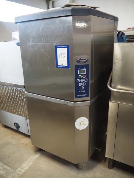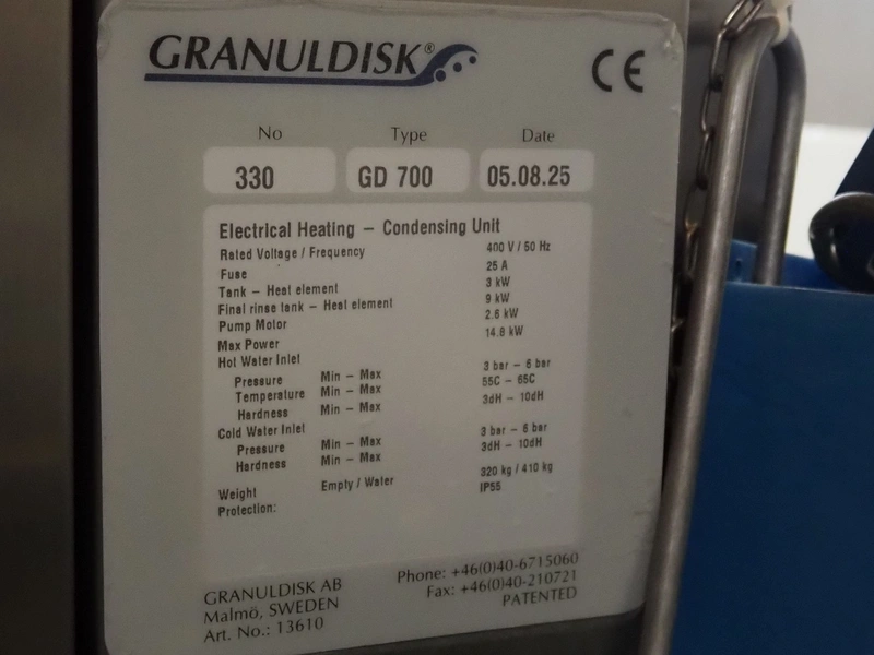 Granuldisk AB dishwasher, type: GD 700, number: 330, year of construction: 05.08.25, 400 V, 50 Hz, 25 A, 14.8 kW, weight: 320 kg, electric heated, dimensions: 1200 mm x 850 mm x 1720 mm.