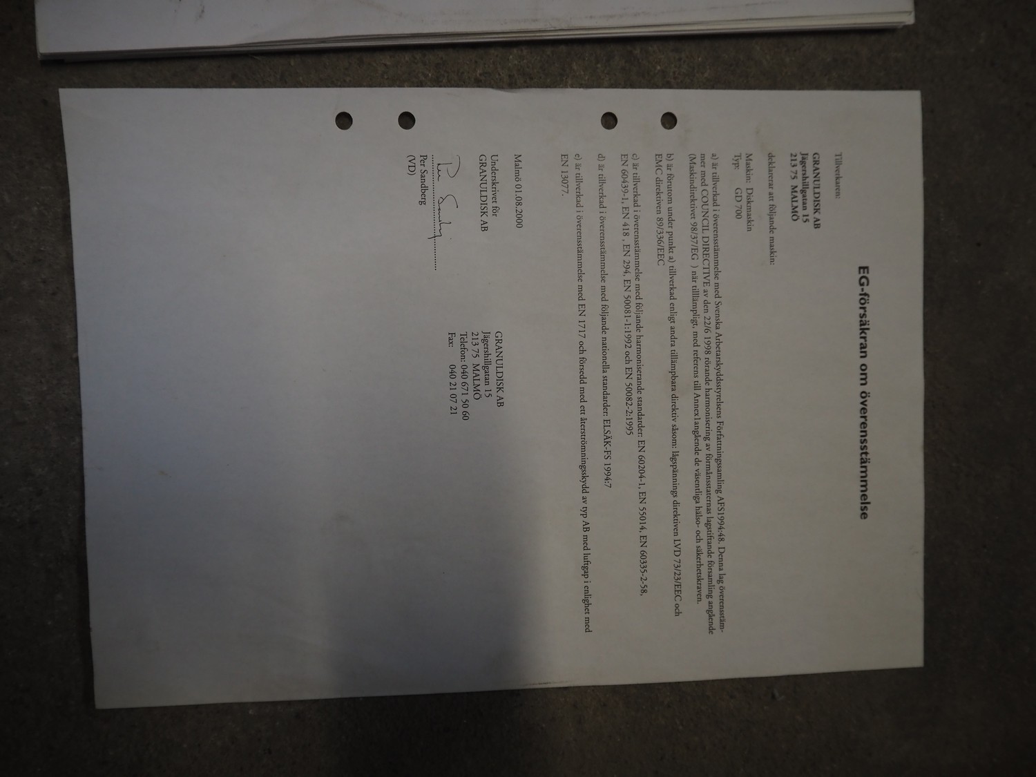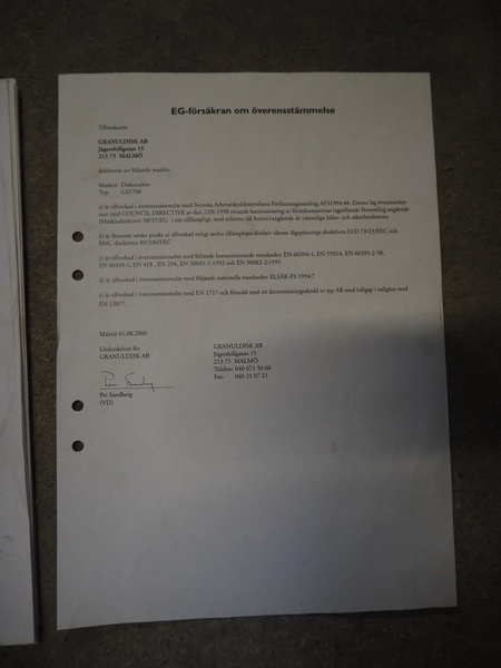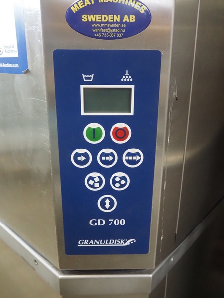 Granuldisk AB dishwasher, type: GD 700, number: 330, year of construction: 05.08.25, 400 V, 50 Hz, 25 A, 14.8 kW, weight: 320 kg, electric heated, dimensions: 1200 mm x 850 mm x 1720 mm.