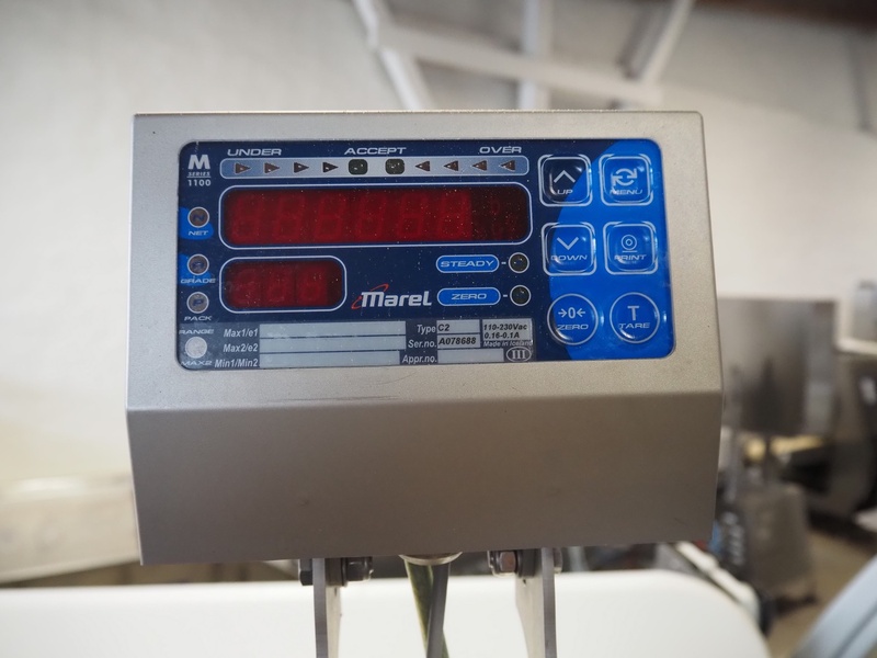 Marel mobile weighing belt, type: C2, serial number: A078688, 110-230 V, 0.16-0.1 A, plastic belt, belt width: 530 mm, total dimensions: 1600 mm x 650 mm x 1800 mm.