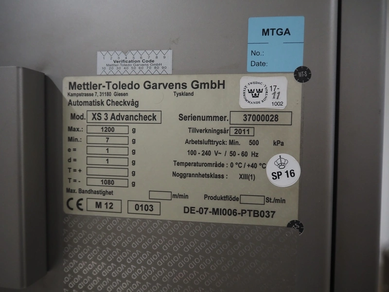 Mettler-Toledo Garvens GmbH X-ray scanner with checkweigher and 2 rejectors, model: XS 3 Advancheck, serial number: 37000028, year of construction: 2011, 100/240 V, 1 Ph, 50-60 Hz, maximum capacity: 1200 g, minimum capacity: 7 g, e=d= 1 g, plastic belts, belt width: 280 mm, 300 mm, and 400 mm, clearance: 350 mm x 150 mm, total dimensions: 3000 mm x 1350 mm x 2100 mm.