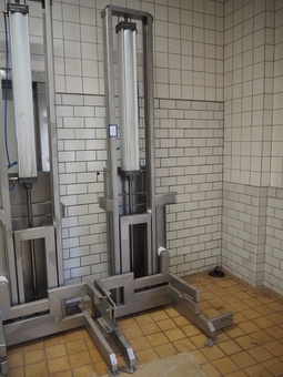 Tilting device for meat bins, tilting height: 1000 mm, total dimensions: 1050 mm x 900 mm x 2650 mm.