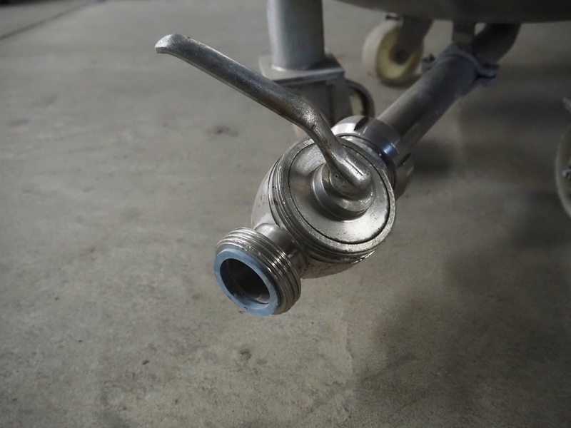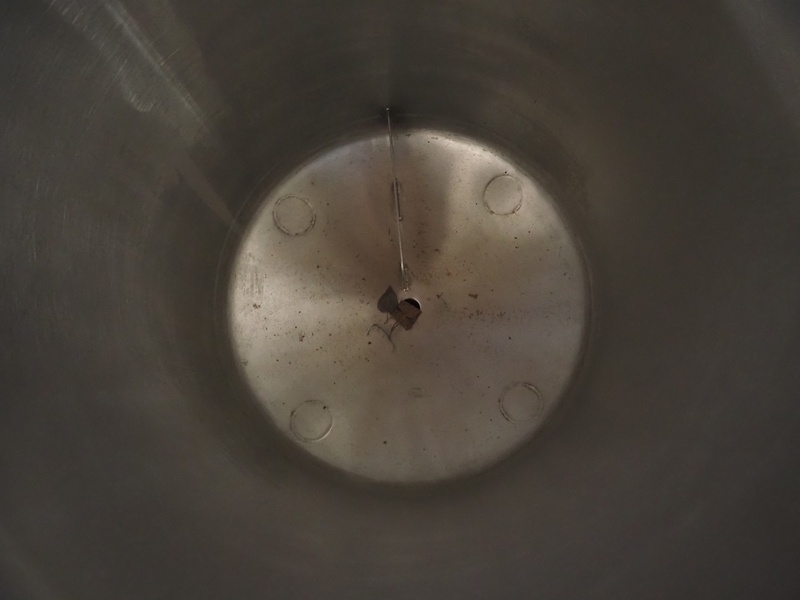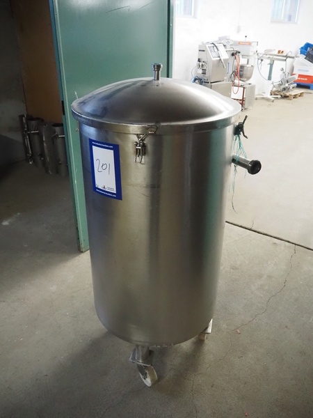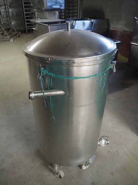 S/s mobile tank with drain, inside dimensions: Ø 590 mm x 1000 mm, total dimensions: 650 mm x 650 mm x 1400 mm.