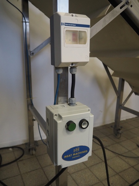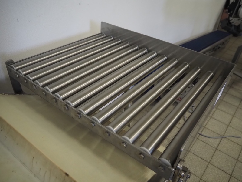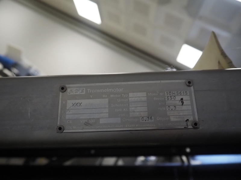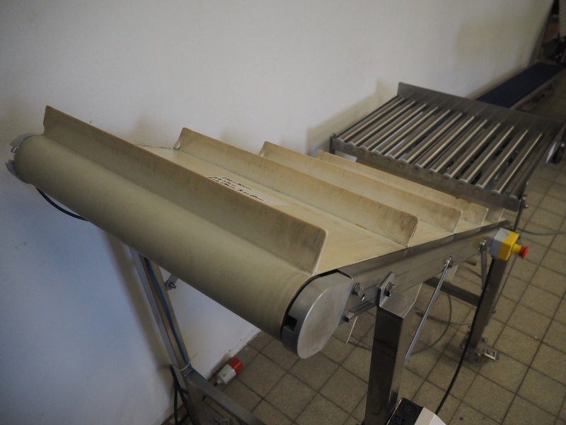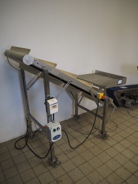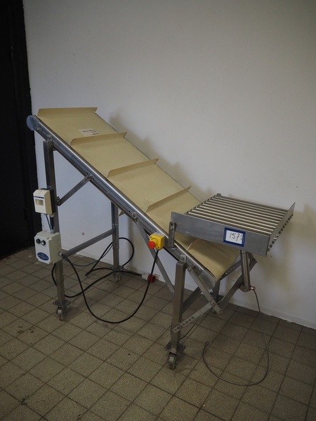 Mobile elevating belt, plastic belt with dividers, belt width: 550 mm, dividers height: 50 mm, distance between dividers: 310 mm, elevating height: 1360 mm, s/s rollers, roller width: 490 mm, total dimensions: 1530 mm x 780 mm x 1400 mm.