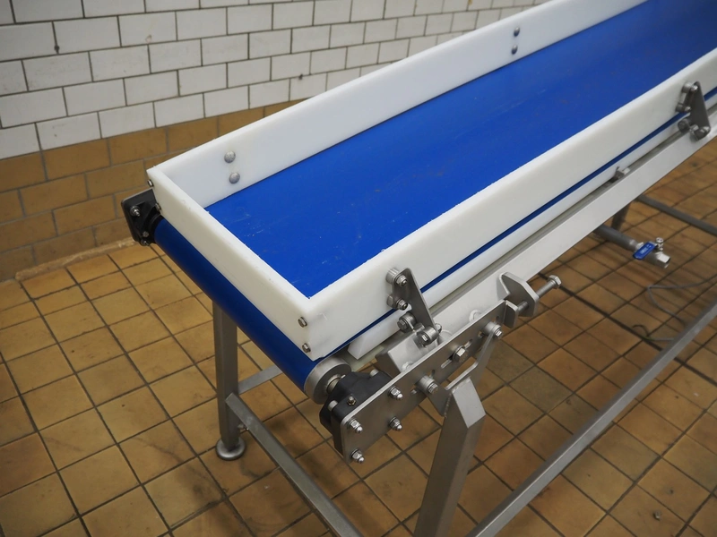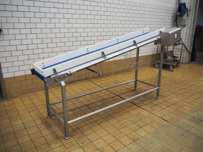 Elevating belt, s/s frame, plastic belt, belt width: 400 mm, elevating height: 1300 mm, total dimensions: 2500 mm x 700 mm x 1420 mm.