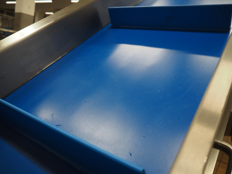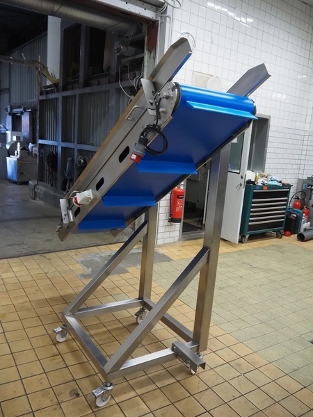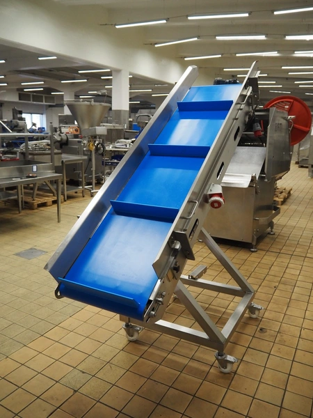 Holac mobile elevating belt, type: GFA-5-2000, serial number: 006-50-108, year of construction: 2017, 400 V, 50 Hz, 2 A, 0.55 kW, plastic belt with dividers, belt width: 490 mm, divider height: 75 mm, distance between dividers: 540 mm, elevating height: 1850 mm, total dimensions: 2000 mm x 800 mm x 2050 mm.