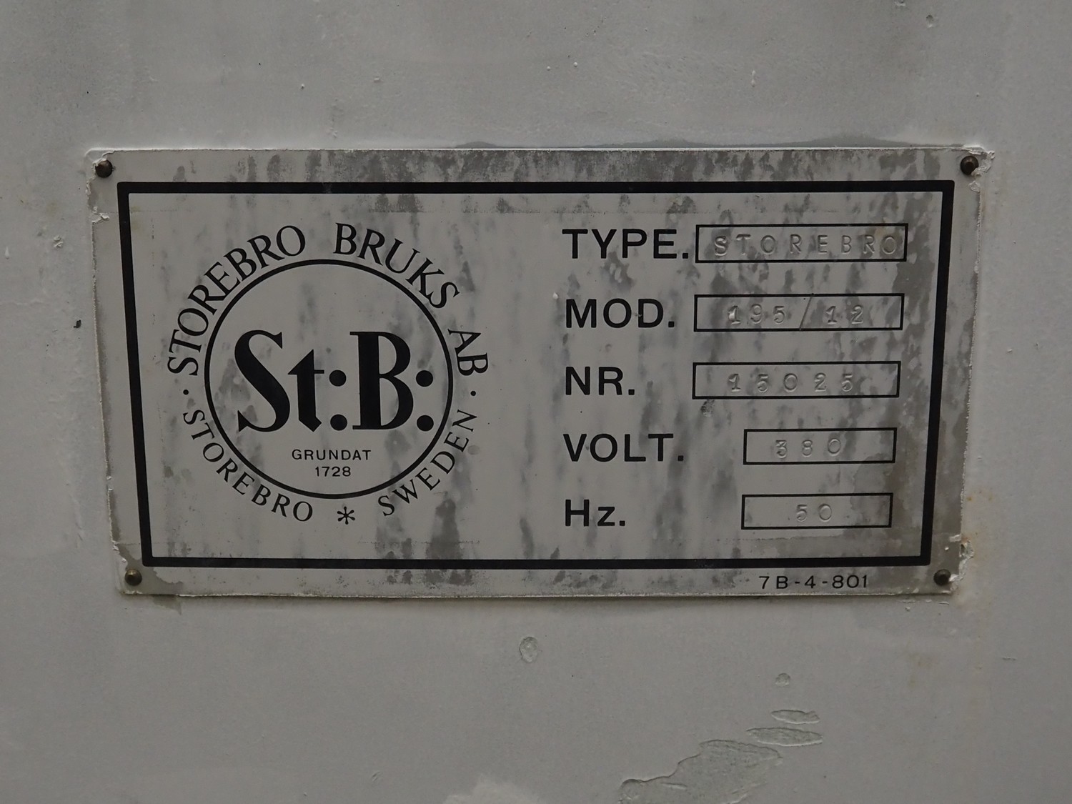 Storebro Bruks AB lathe, type: storebro, model: 195/121, number: 15025, 380 V, 50 Hz, dimensions: 2000 mm x 650 mm x 1300 mm. Including steel cabinet with parts.