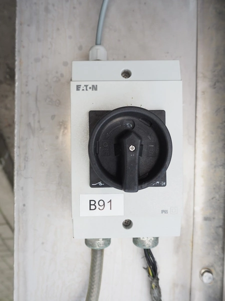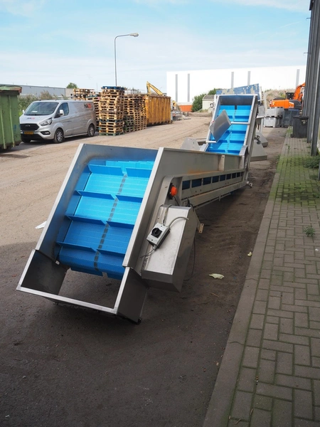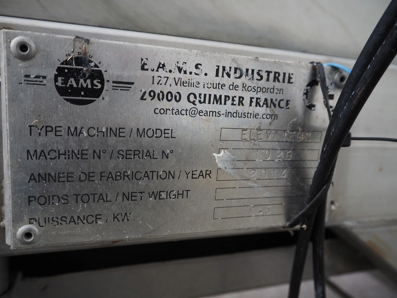 E.A.M.S INDUSTRIE elevating belt, plastic belt with dividers, type: ELEVATEUR, serial number: 1026, year of construction: 2014, 1.5 kW, belt width: 750 mm, distance between dividers: 250 mm, divider height: 100 mm, total dimensions: 7100 mm x 1200 mm x 1400 mm.