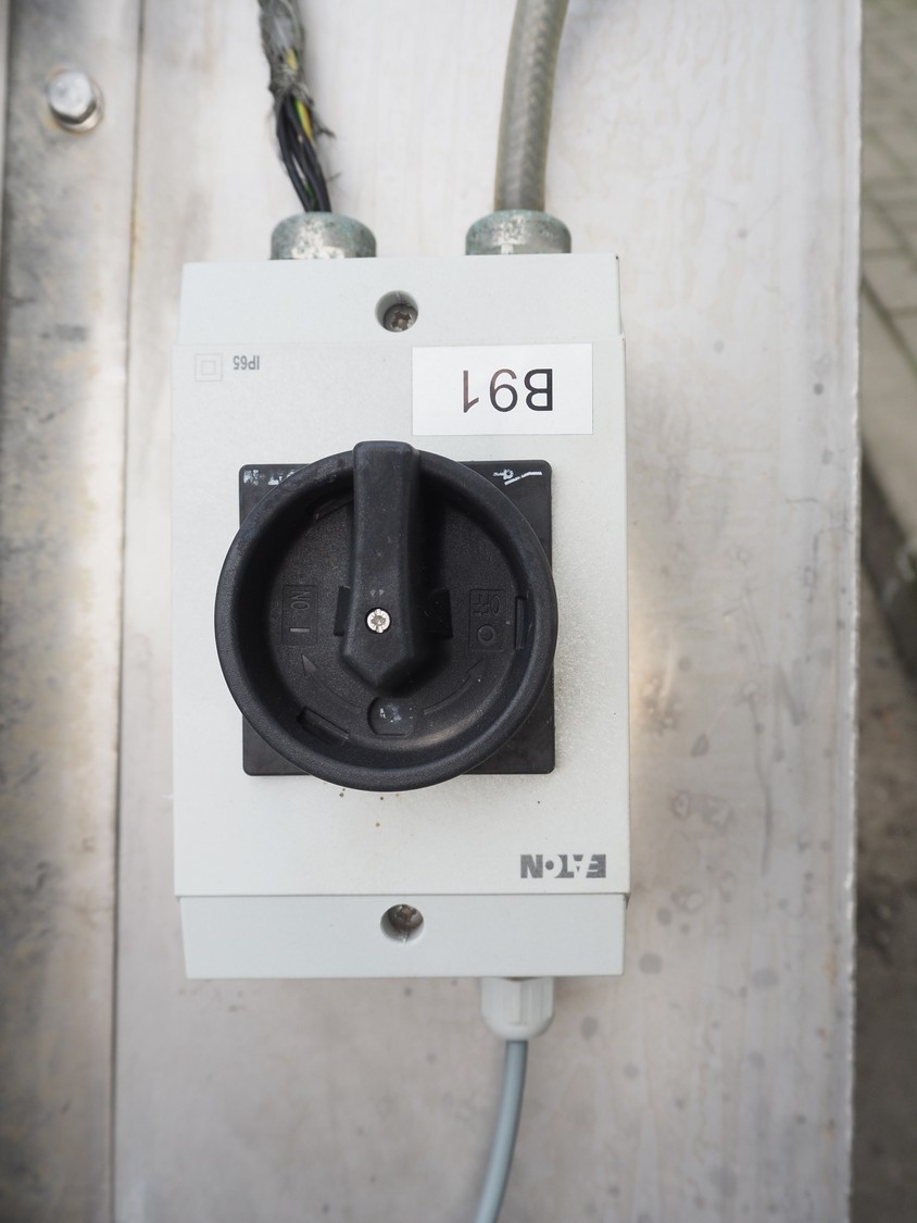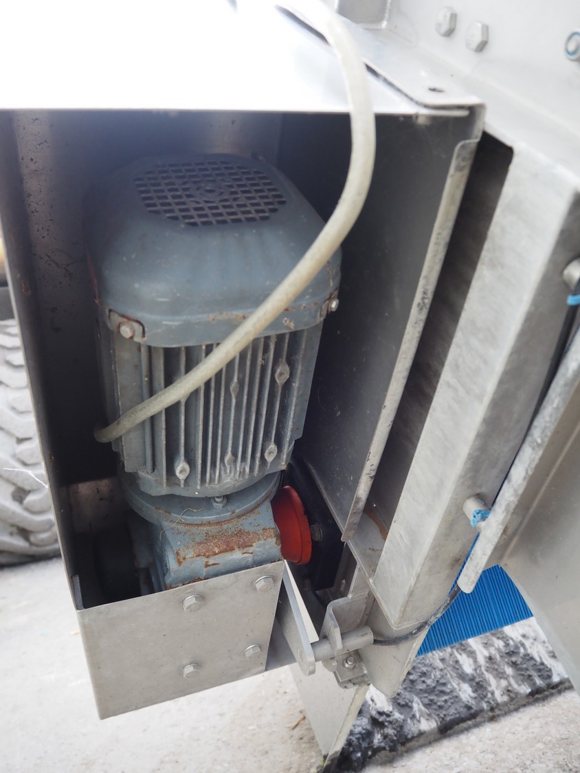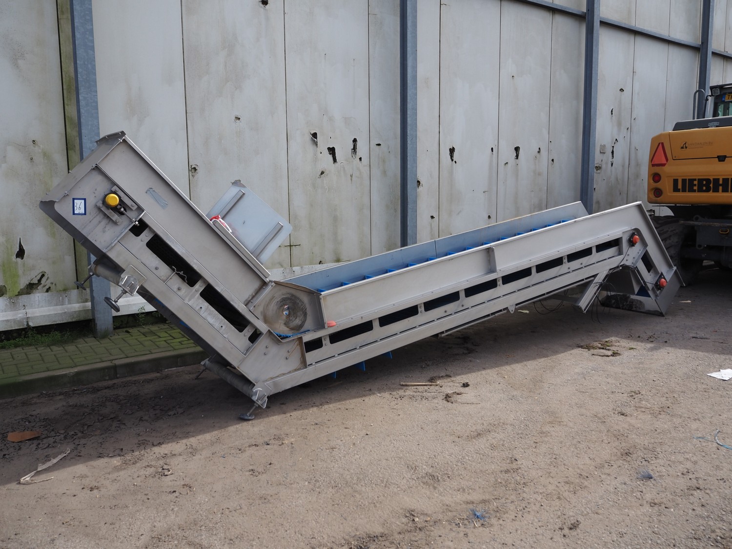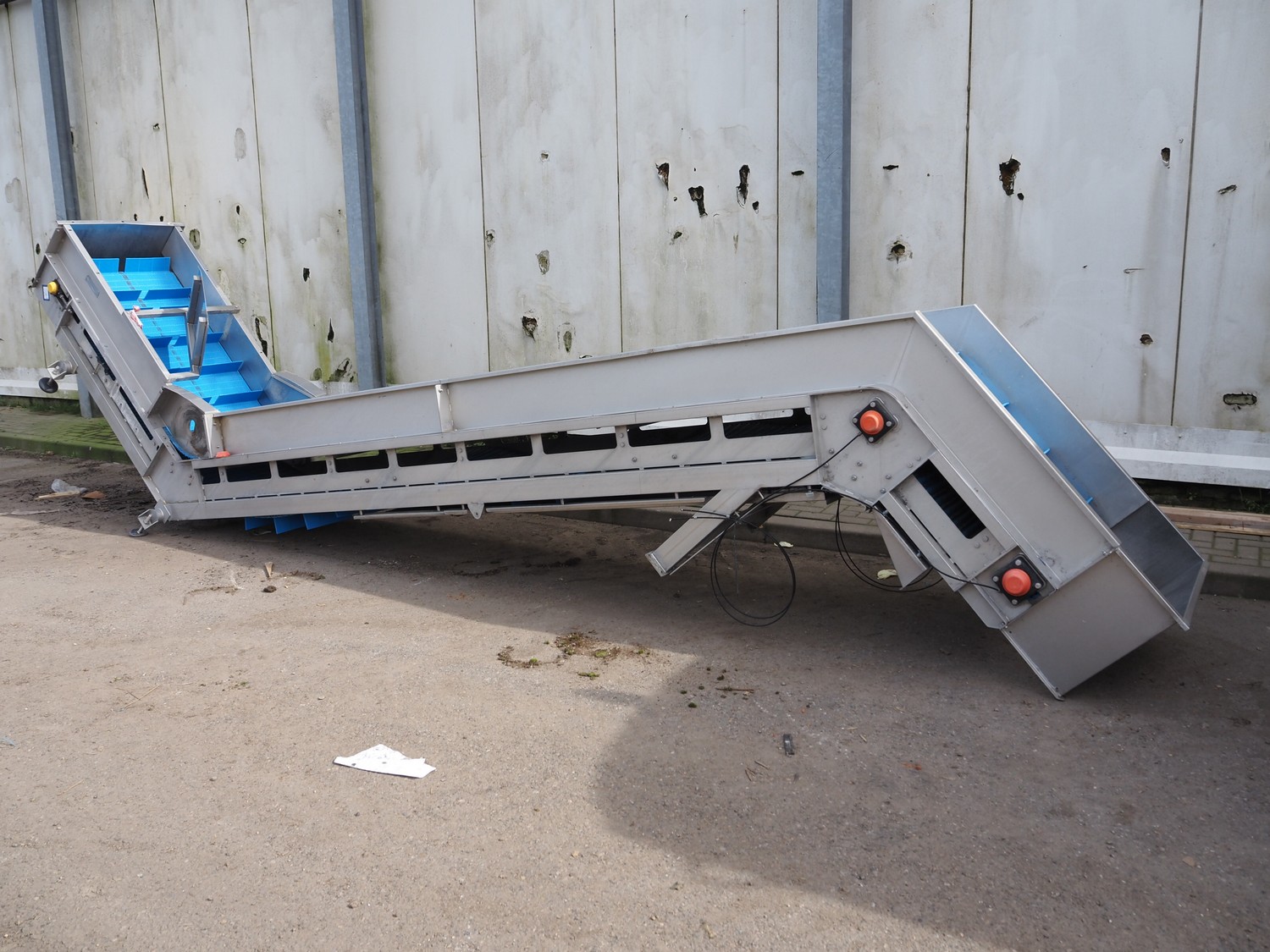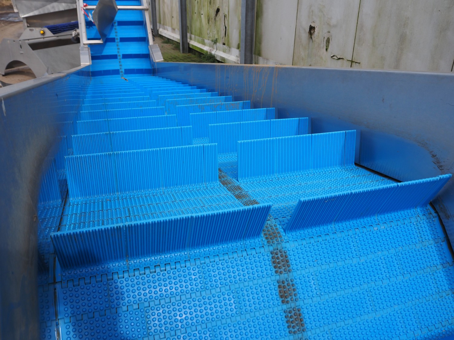 E.A.M.S INDUSTRIE elevating belt, plastic belt with dividers, type: ELEVATEUR, serial number: 1026, year of construction: 2014, 1.5 kW, belt width: 750 mm, distance between dividers: 250 mm, divider height: 100 mm, total dimensions: 7100 mm x 1200 mm x 1400 mm.