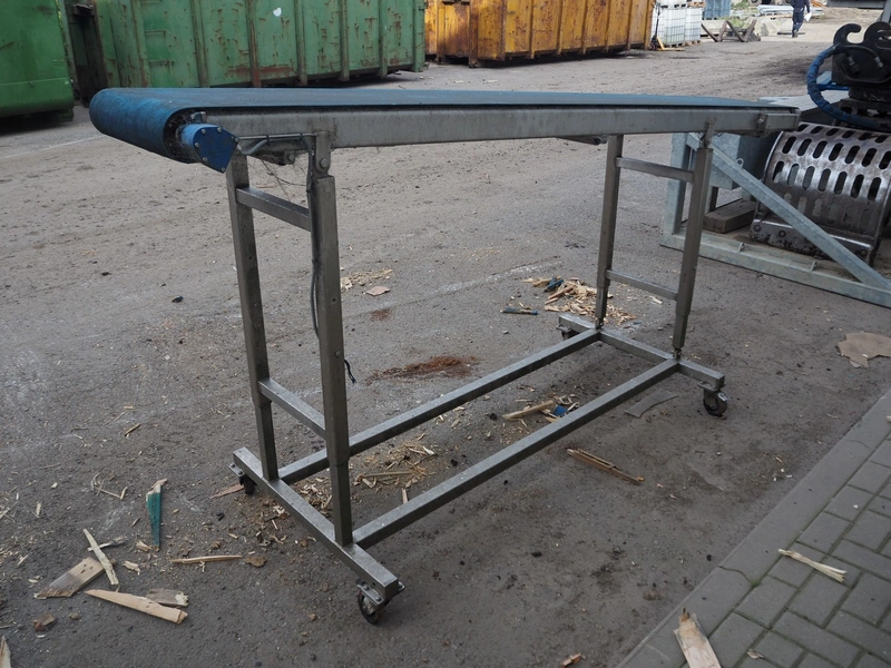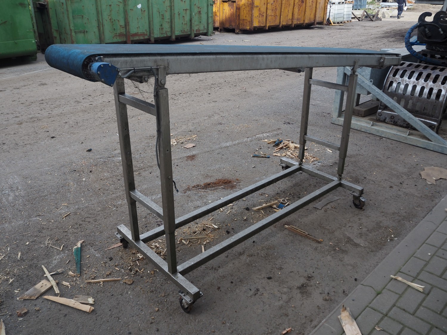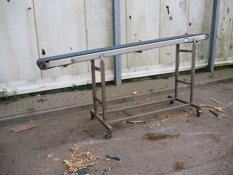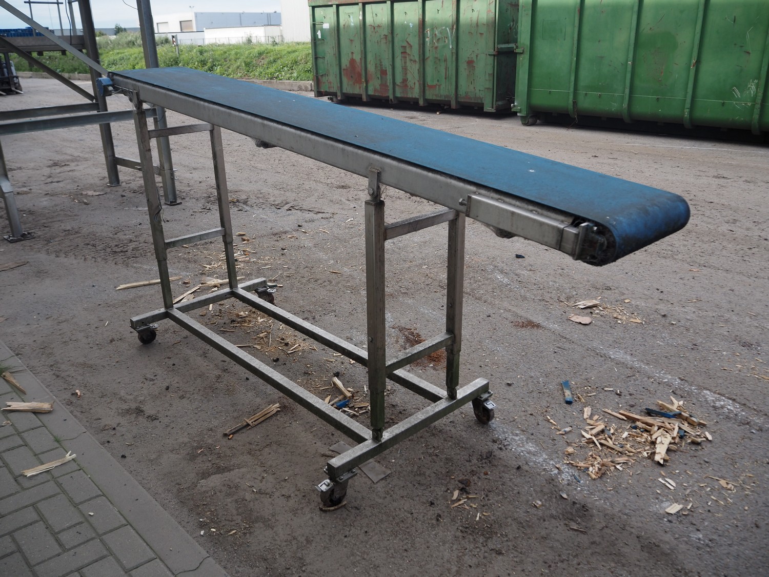 Mobile elevating belt, plastic belt, belt width: 420 mm, elevating height: 1500 mm, total dimensions: 3000 mm x 900 mm x 1550 mm.