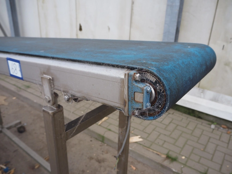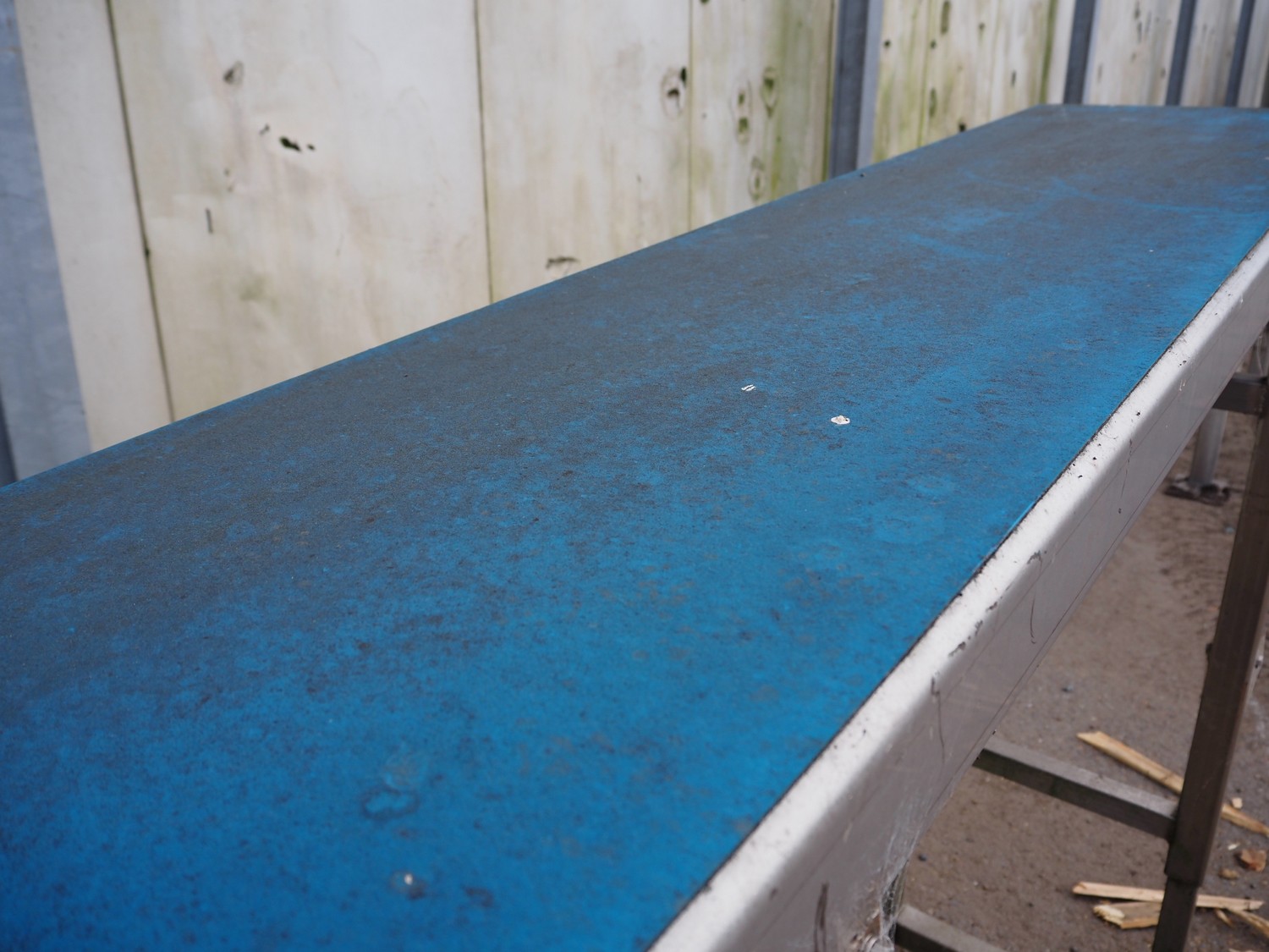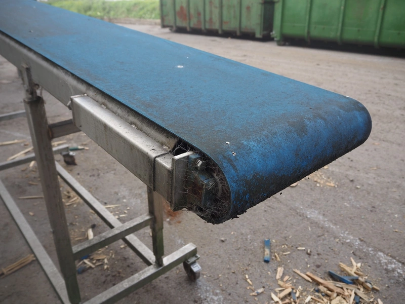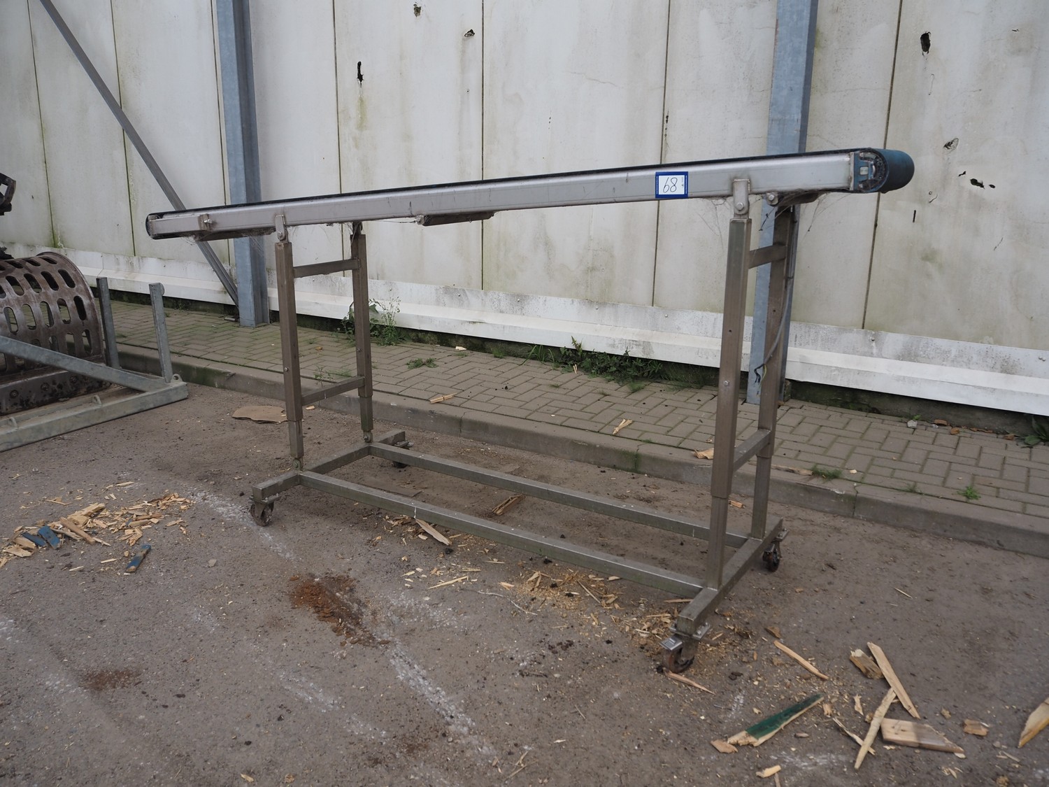 Mobile elevating belt, plastic belt, belt width: 420 mm, elevating height: 1500 mm, total dimensions: 3000 mm x 900 mm x 1550 mm.