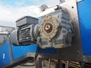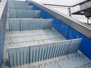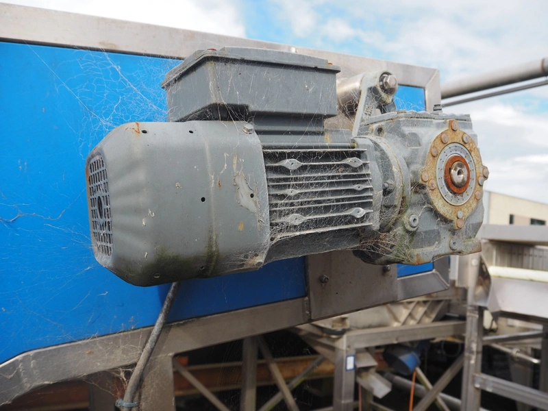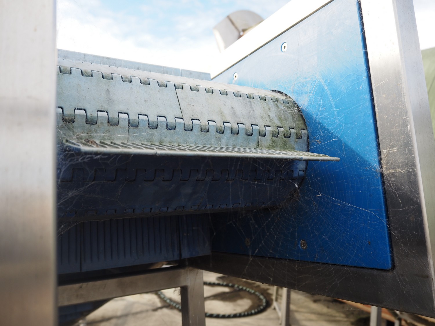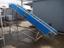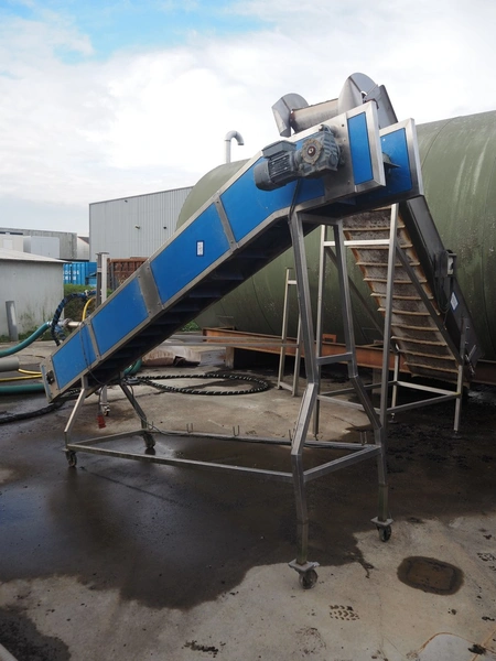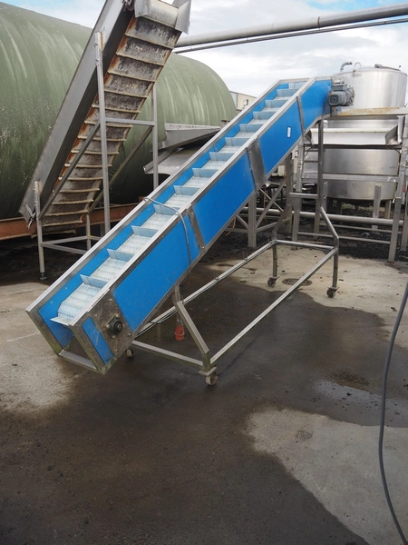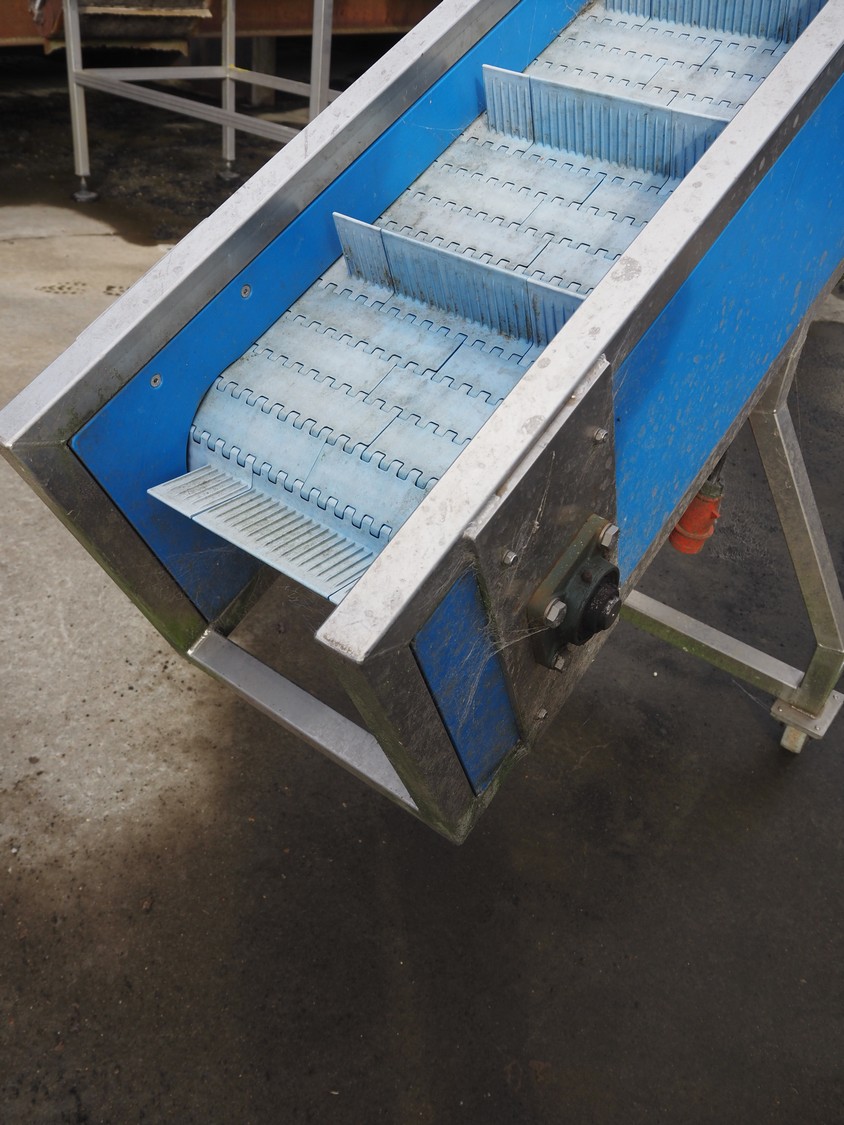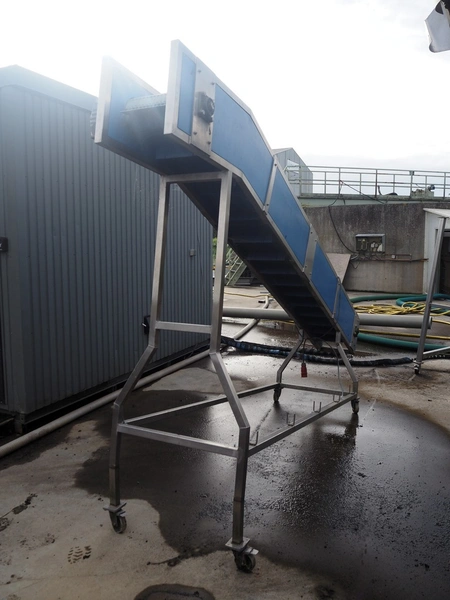 Mobile elevating belt, plastic belt with dividers, belt width: 320 mm, distance between dividers: 250 mm, divider height: 70 mm, elevating height: 2200 mm, total dimensions: 3900 mm x 700 mm x 2300 mm.