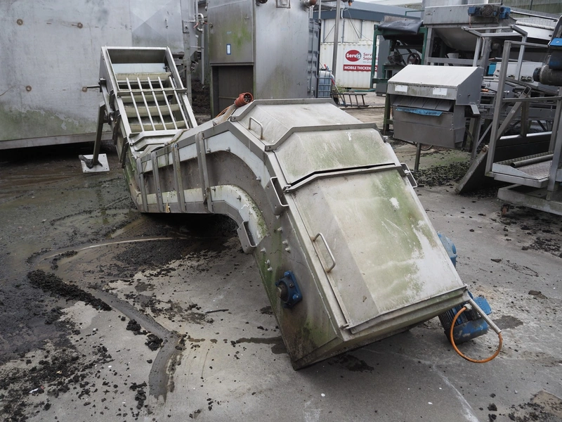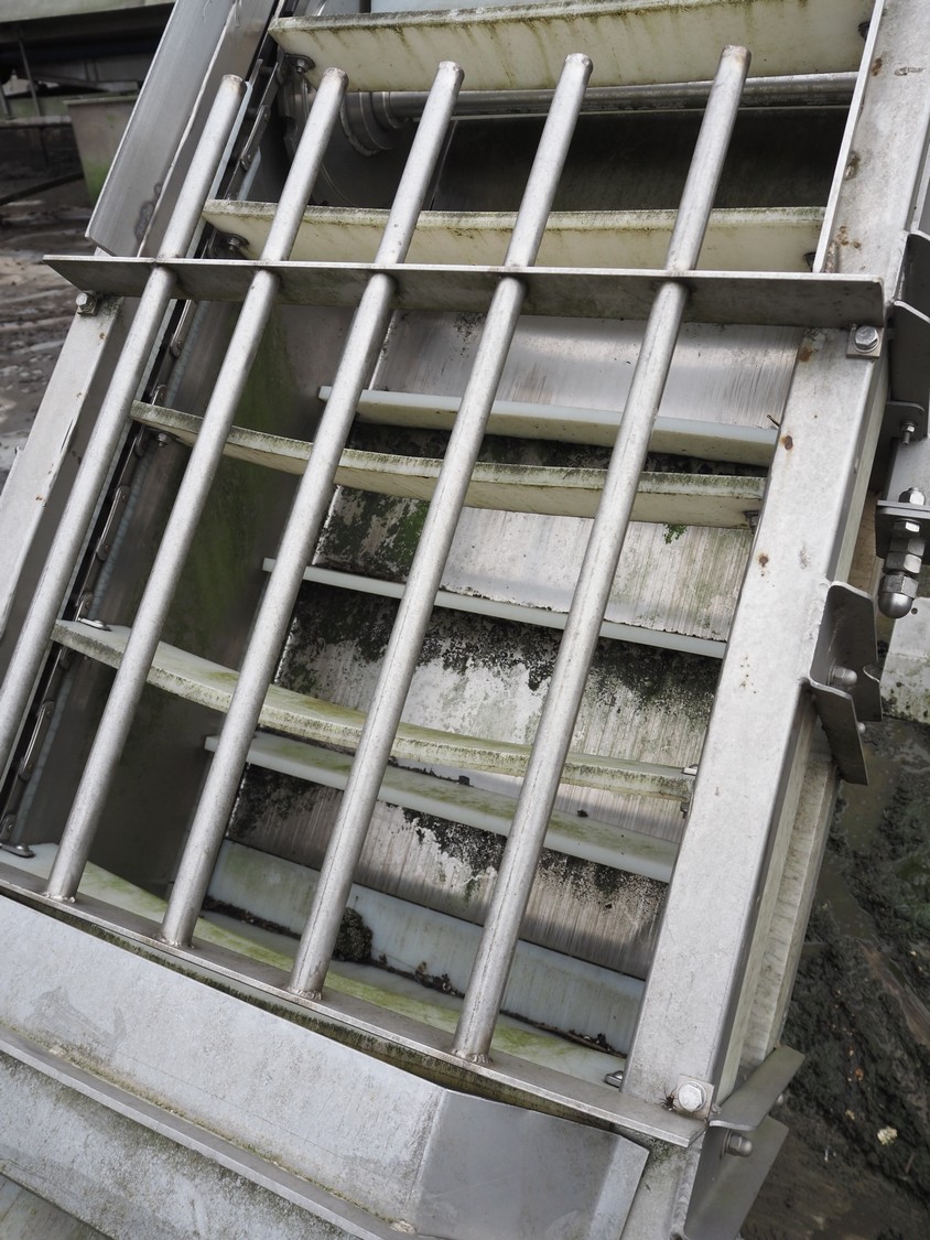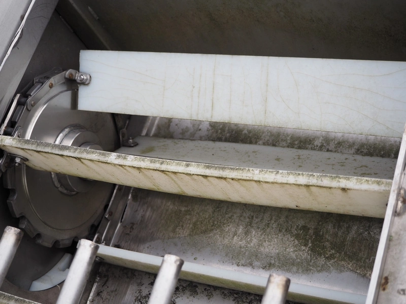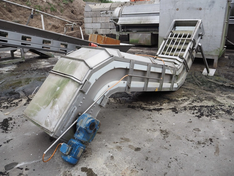 Elevating belt, plastic belt with dividers, distance between dividers: 195 mm, total dimensions: 4500 mm x 1000 mm x 1500 mm.