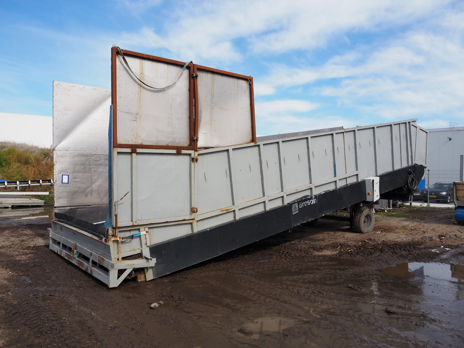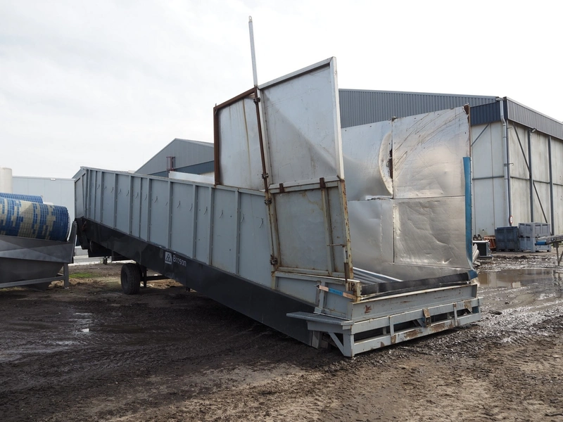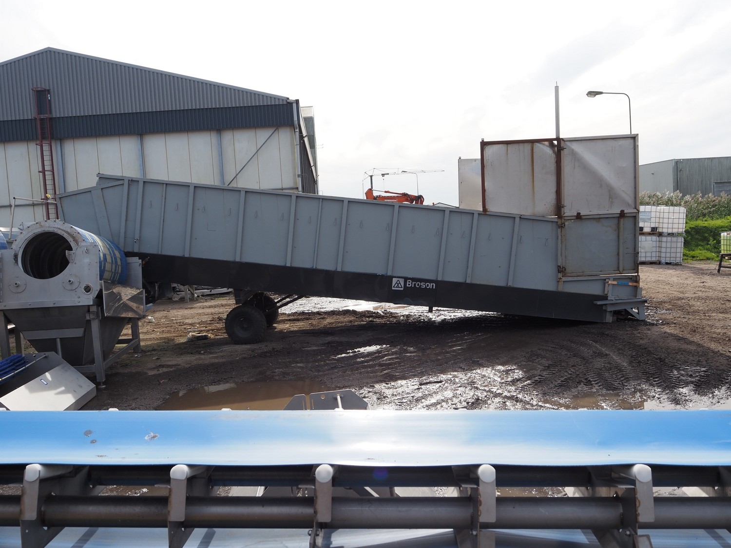 Broson mobile infeed bunker, plastic belt, belt width: 2650 mm, elevating height: 1900 mm, total dimensions: 11500 m x 3500 mm x 3600 mm.