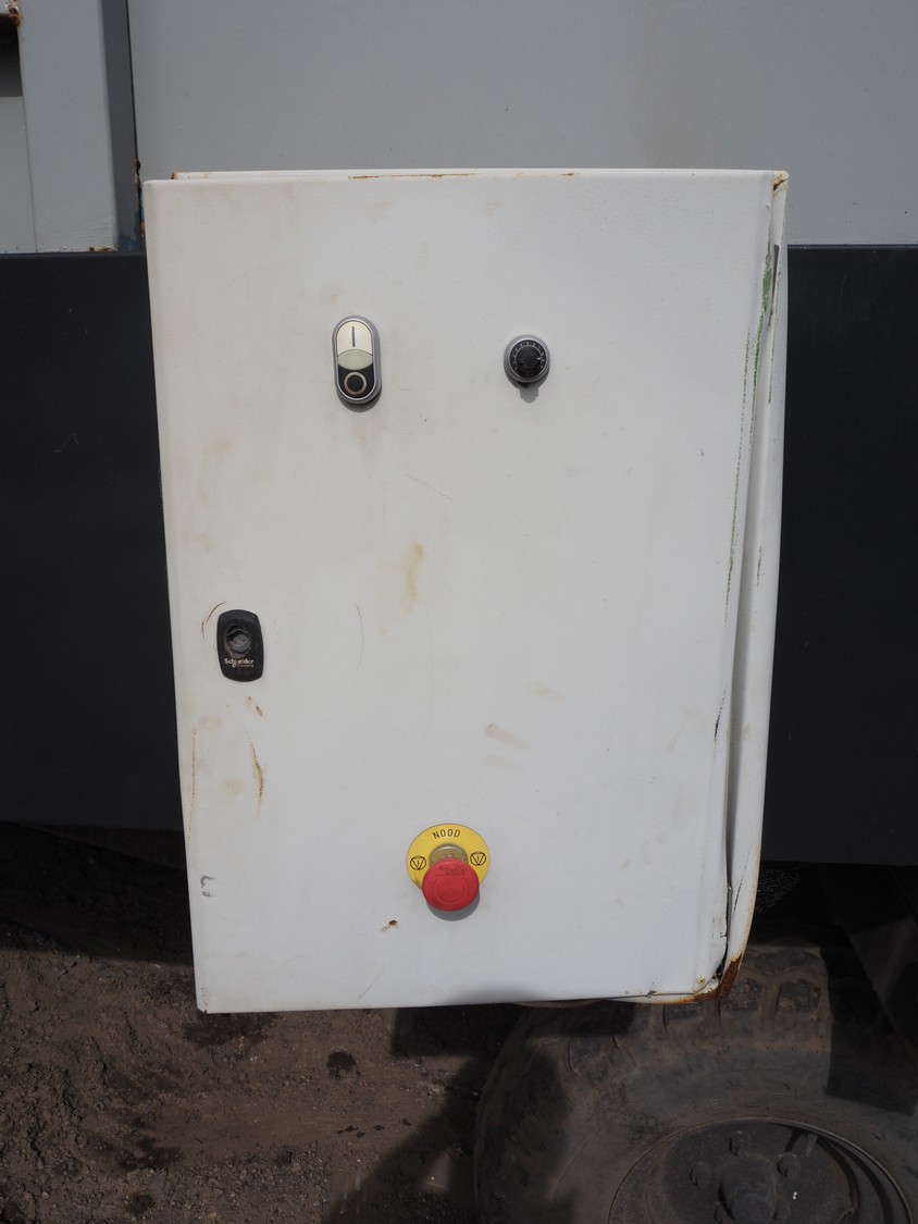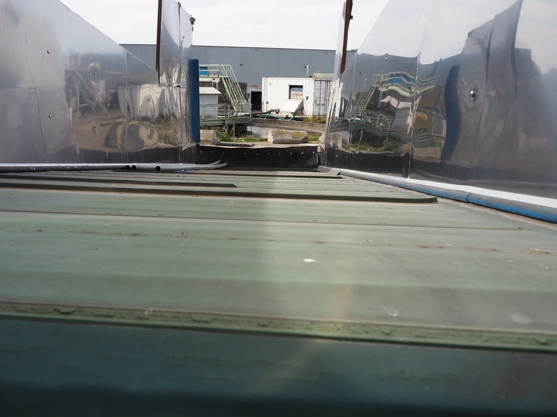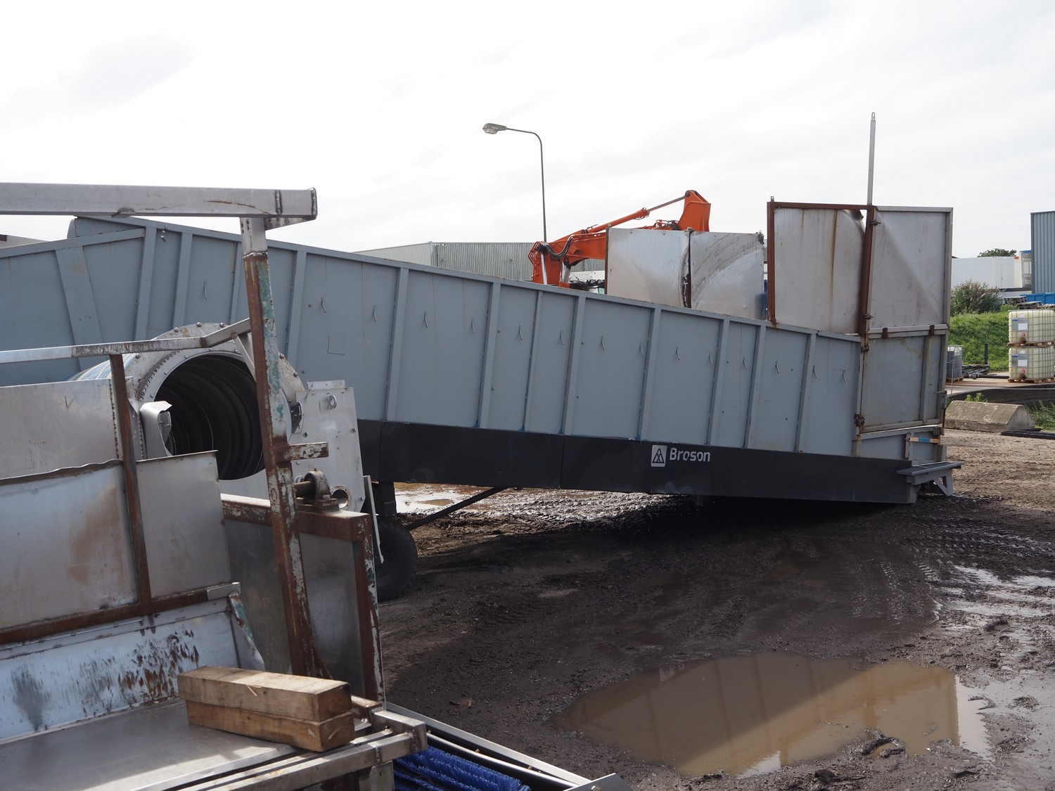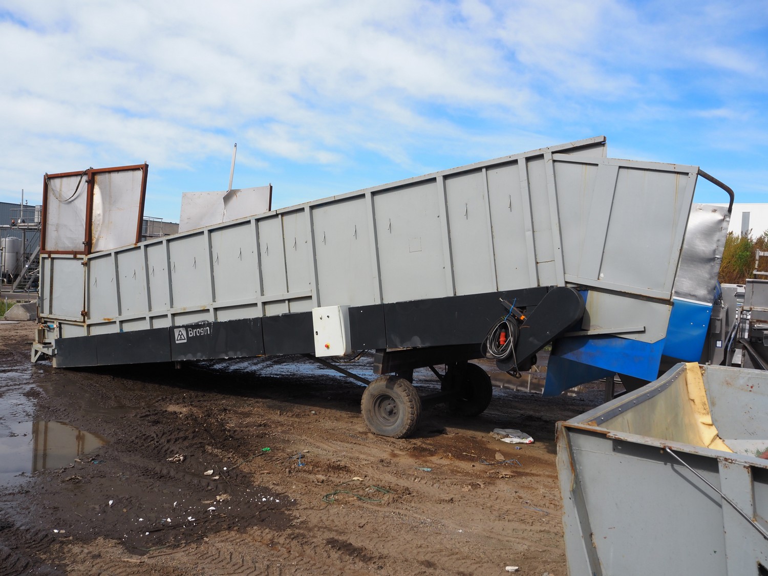Broson mobile infeed bunker, plastic belt, belt width: 2650 mm, elevating height: 1900 mm, total dimensions: 11500 m x 3500 mm x 3600 mm.