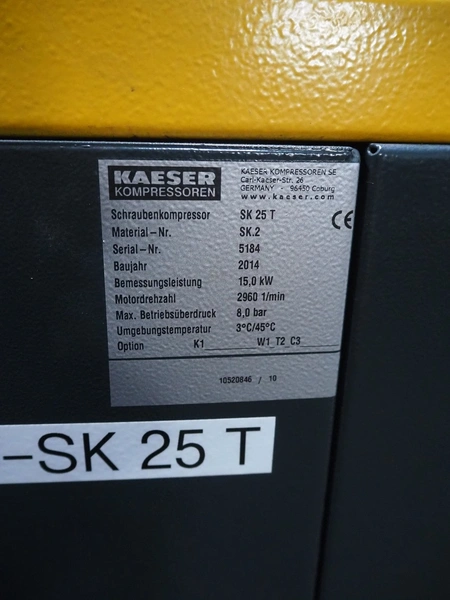 Kaeser screw compressor, type: SK 25 T, serial number: 5184, year of construction: 2014, 400 V, 3 Ph, 50 Hz, 32 A, 15 kW, 8.0 bar, type air-dryer, ABT 25, serial number: 1995, year of construction: 2011, 230 V, 1 Ph, 50/60 Hz, refrigerant: R134a/0.65 kg, dimensions: 750 mm x 1220 mm x 1240 mm.