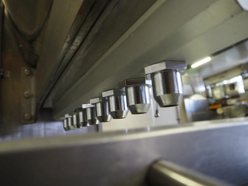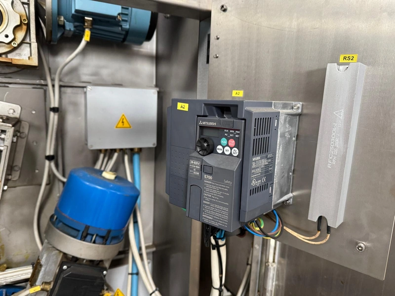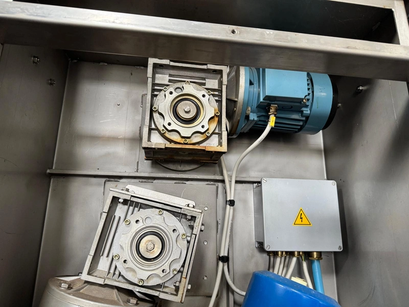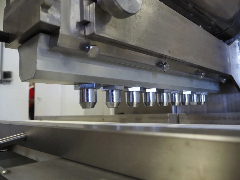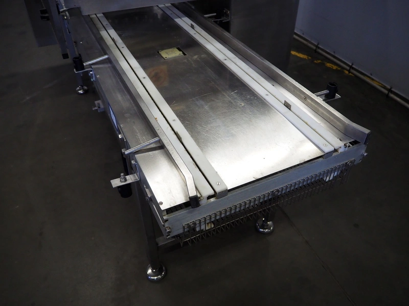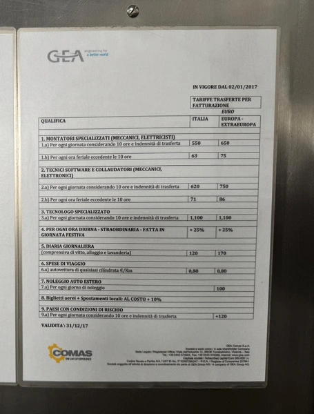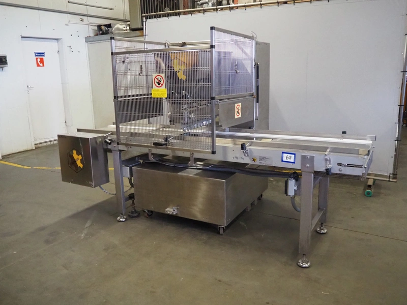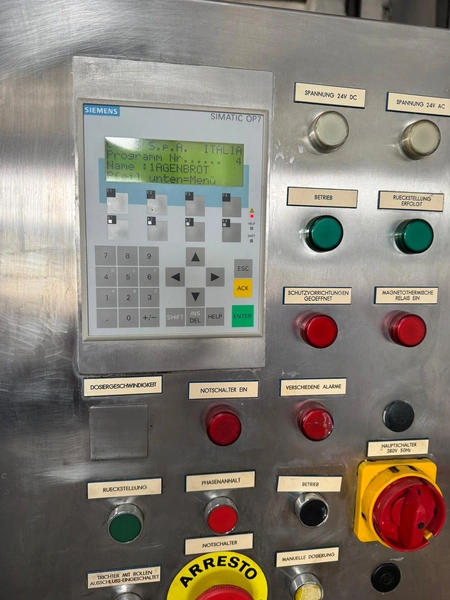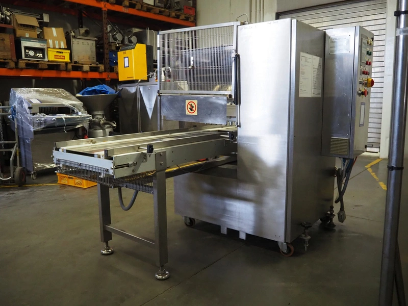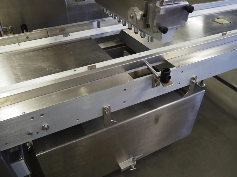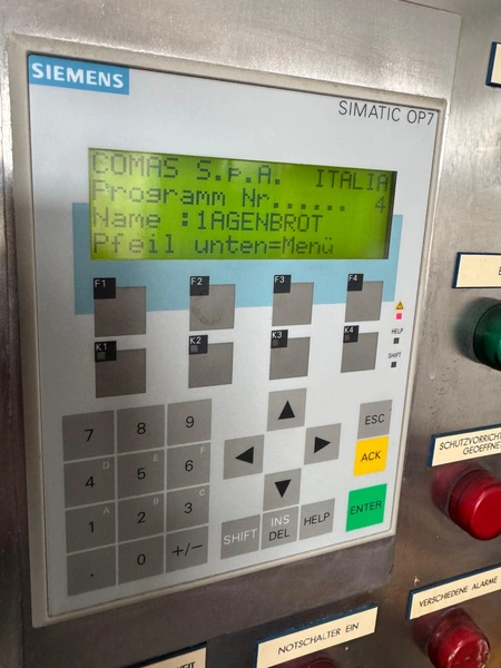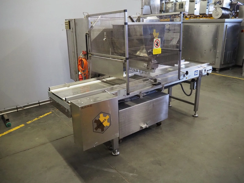 Comas s.p.a. mobile 9-heads depositor, machine number: 2189, 380 V, 3 Ph, 50 Hz, 10 A, dimensions: 1050 mm x 1600 mm x 1600 mm. With chain belt, belt width: 450 mm, total dimensions: 2770 mm x 850 mm x 900 mm.