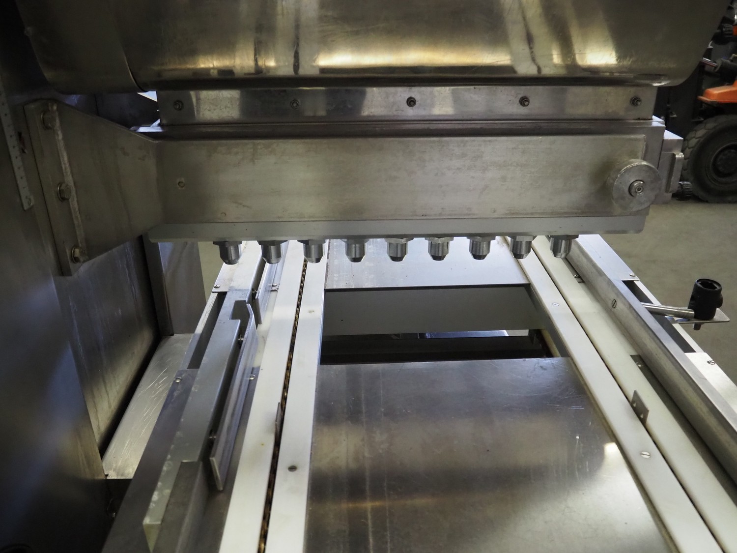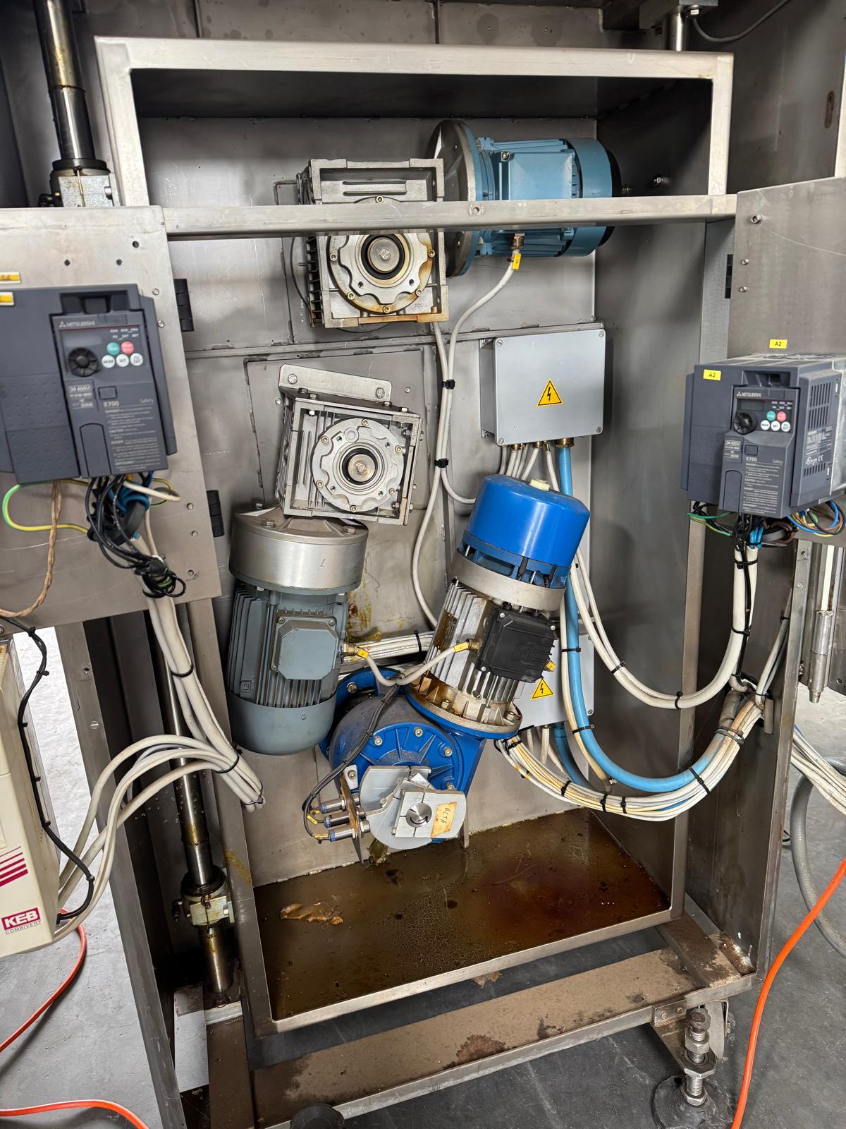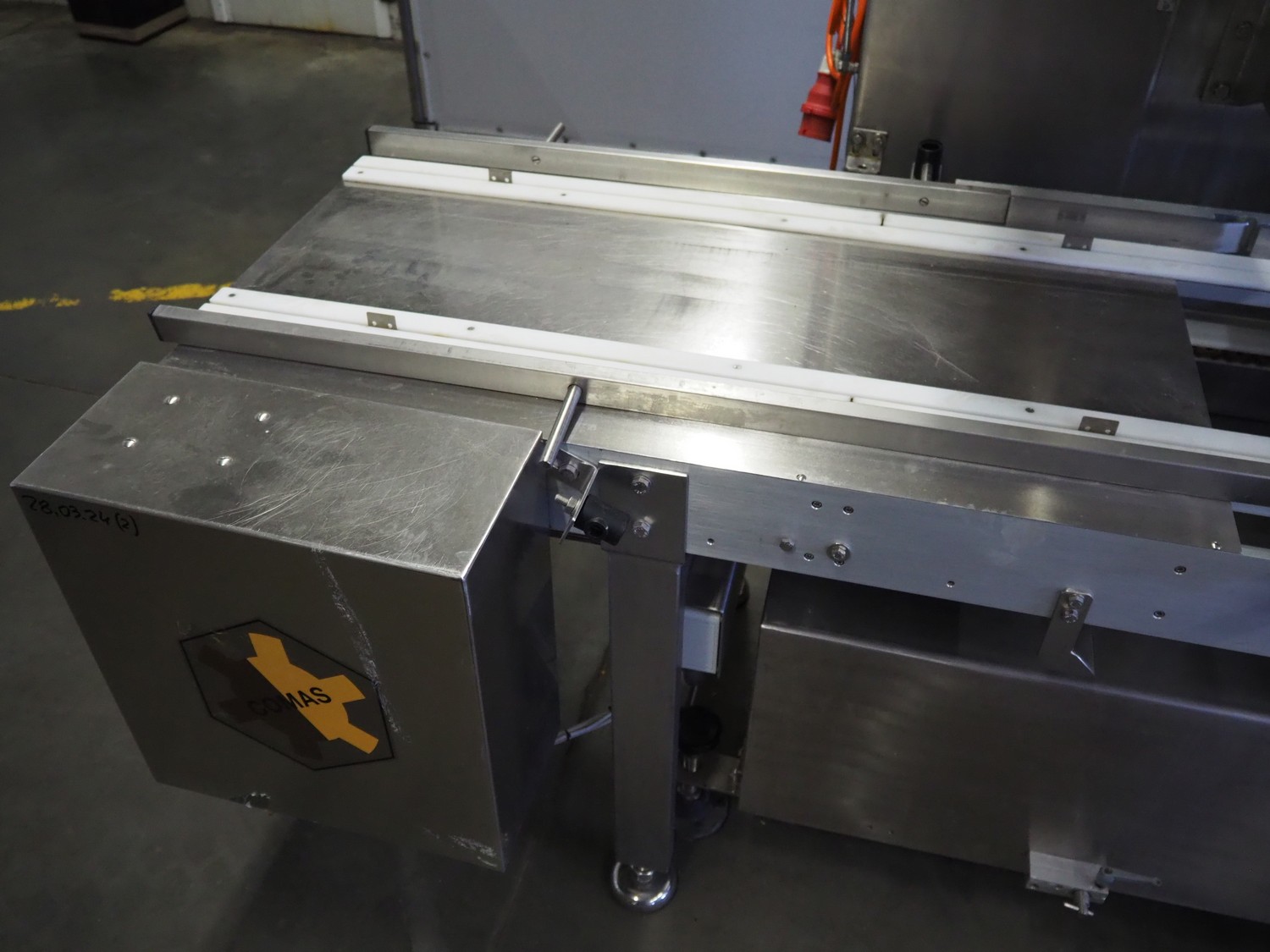Comas s.p.a. mobile 9-heads depositor, machine number: 2189, 380 V, 3 Ph, 50 Hz, 10 A, dimensions: 1050 mm x 1600 mm x 1600 mm. With chain belt, belt width: 450 mm, total dimensions: 2770 mm x 850 mm x 900 mm.