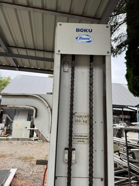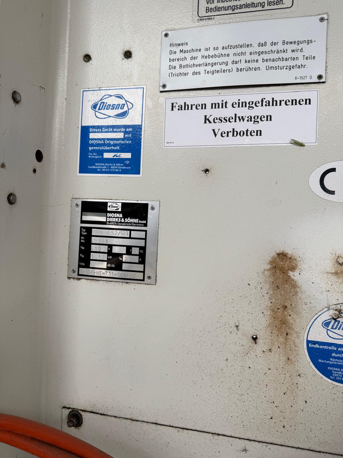 Diosna steel bowl lifter, type: BOKU 52/933, number: 49381, 400 V, 50 Hz, 1.1 kW, capacity: 550 kg, tipping height: 1800 mm, total dimensions: 1500 mm x 1100 mm x 2500 mm.