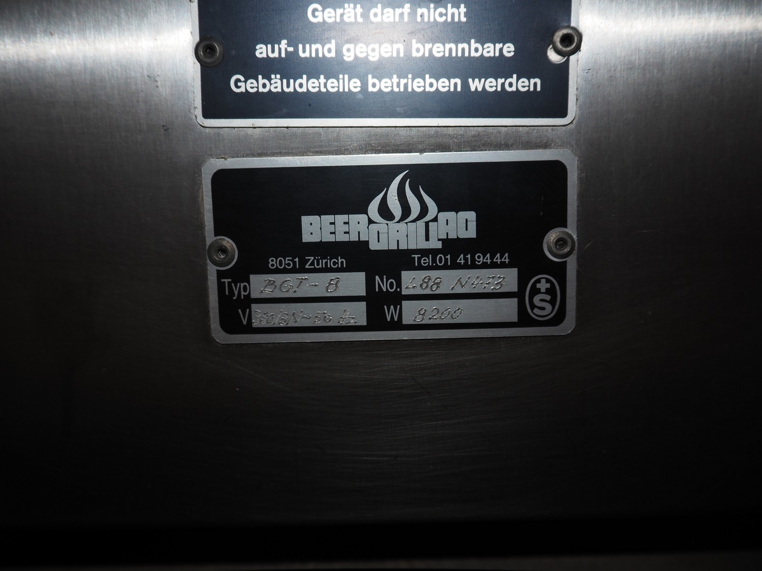 Beer Grill AG rotisserie grill, type: BGT-8, number: 488 N473, 380 V, 3 Ph, 50 Hz, 8200 W, dimensions: 1000 mm x 840 mm x 1060 mm.