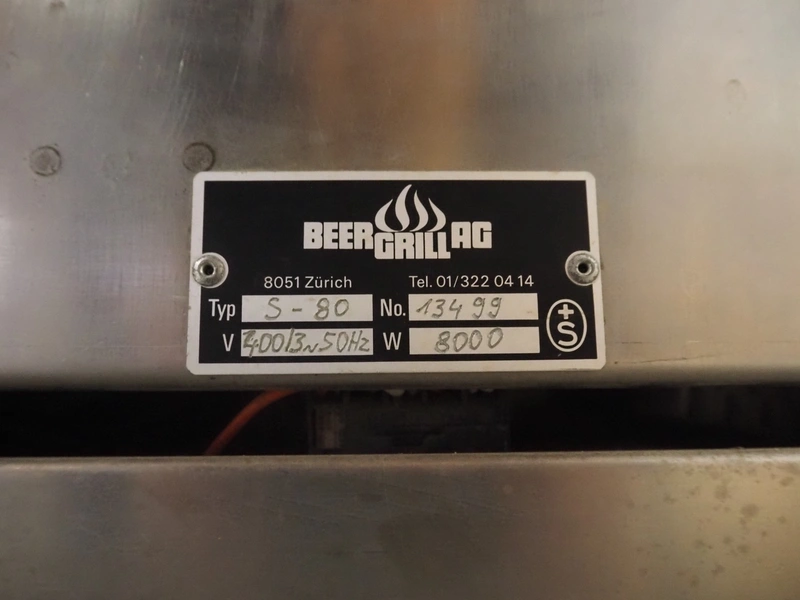 Beer Grill AG electric grill, type: 5-80, number: 13499, 400 V, 3 Ph, 50 Hz, 8000W, 3 floors, floor dimensions: (3x) 800 mm x 450 mm, total dimensions: 1010 mm x 510 mm x 420 mm.