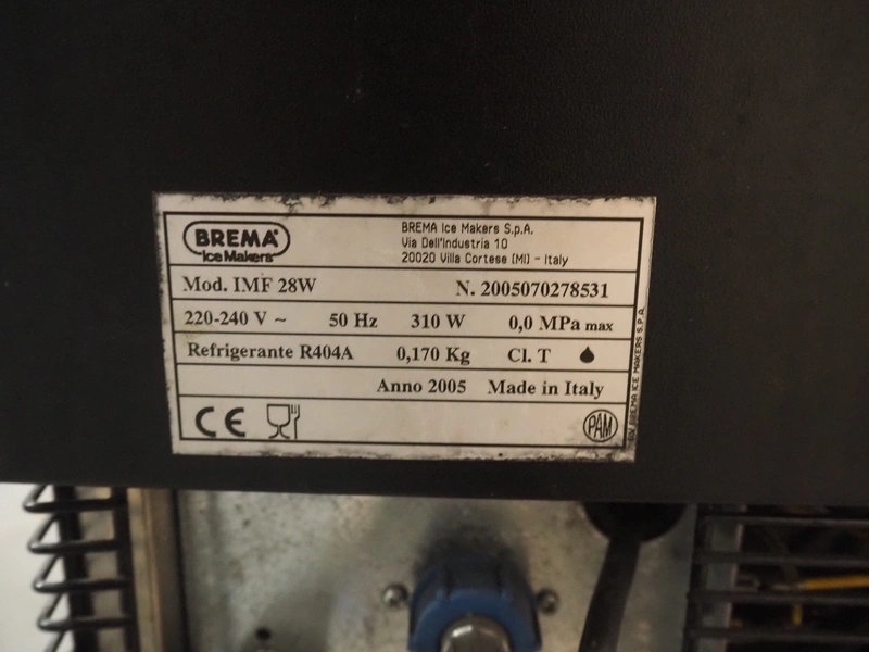 Brema ice machine, model: IMF.28W, number: 2005070278531, year of construction: 2005, 220-240 V, 50 Hz, 310 W, refrigerant: R404A/0.170 kg, dimensions: 390 mm x 460 mm x 590 mm.