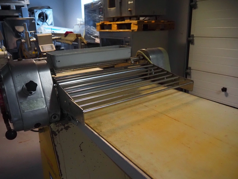 Seewer Rondo mobile dough sheeter, type: Svn-Aut, model: 8-604, series: 6.6, machine number: 466, 230 V, 1 Ph, 50 Hz, 1.1 kW, cloth belt, belt width: 600 mm, total dimensions: 2500 mm x 900 mm x 1140 mm.