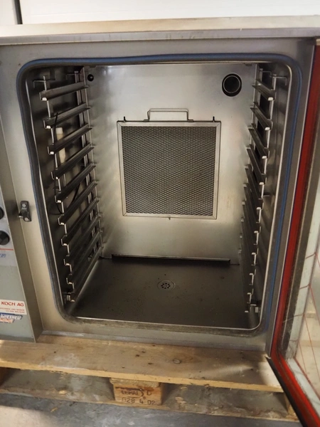 Wiesheu GmbH combi steamer, type: G10M, number: 9214, year of construction: 1993, 380 V, 50 Hz, 14.5 kW, 10 floors, floor dimensions: (10x) 530 mm x 330 mm, total dimensions: 910 mm x 760 mm x 910 mm.