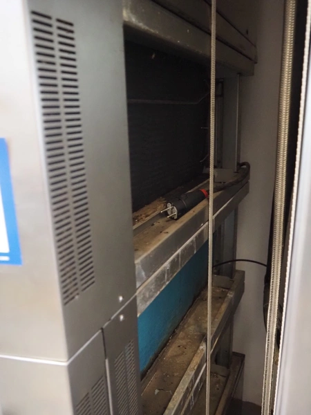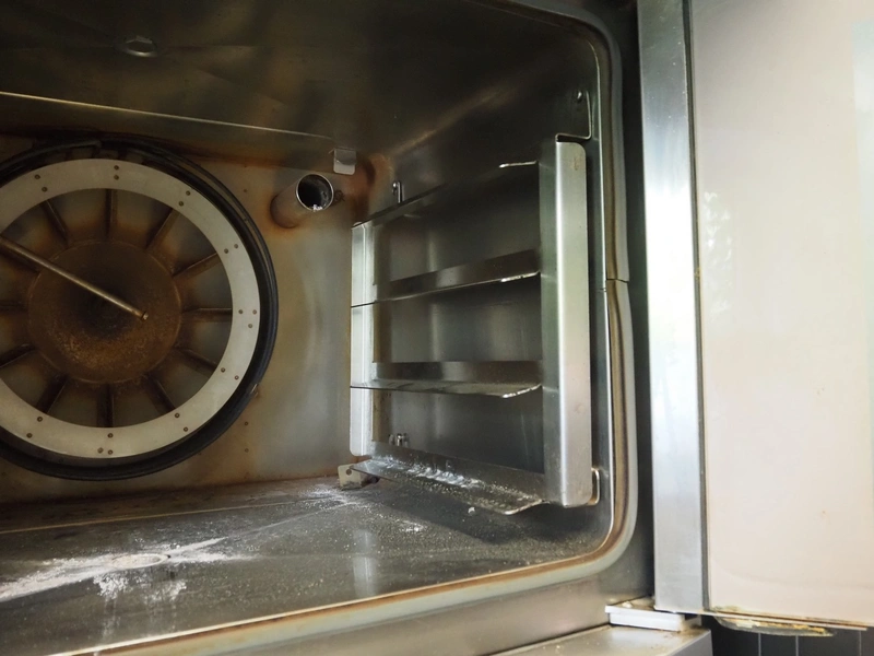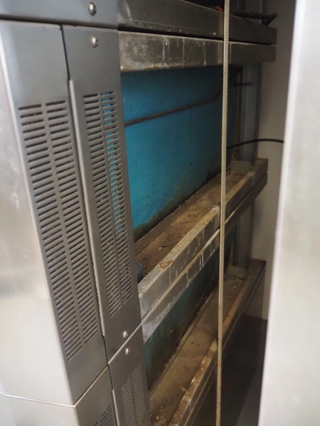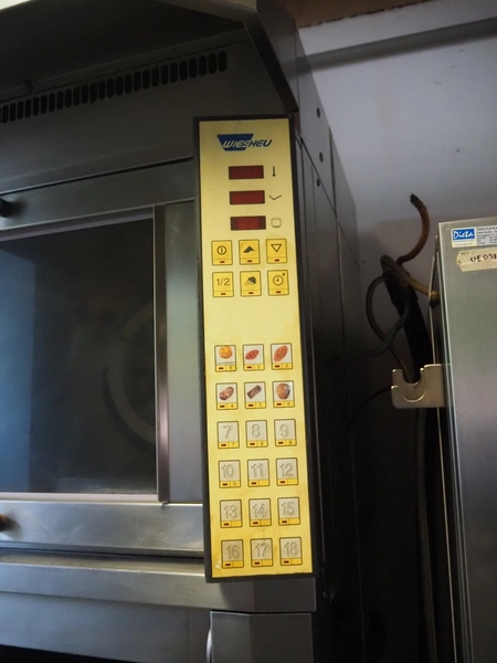 Wiesheu GmbH mobile 3-decks oven, with convection oven and oriifer, type: EBO 1-64R, number: 210944, year of construction: 2004-10, 400 V, 50 Hz, 1.2 kW, inside dimensions deck ovens: (3x) 610 mm x 580 mm x 160 mm, total dimensions: 940 mm x 960 mm x 2320 mm. Missing covers.