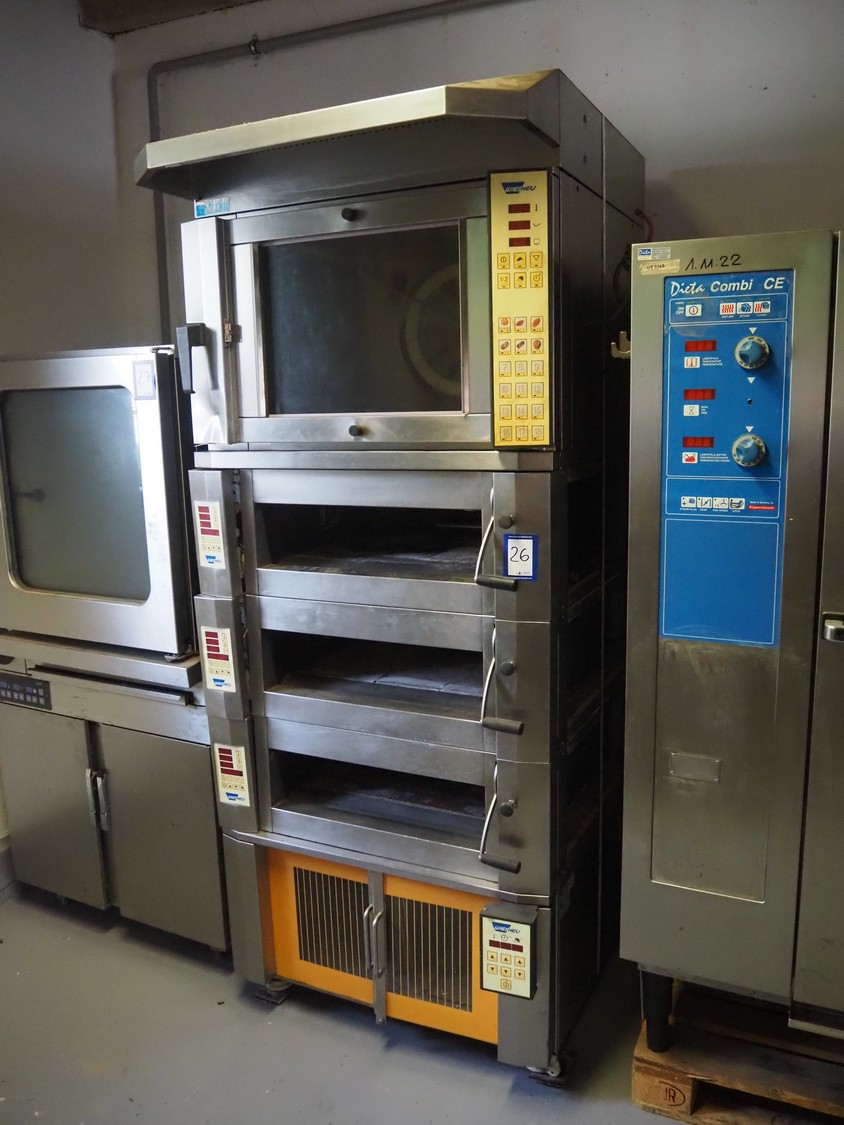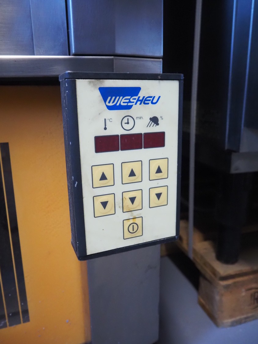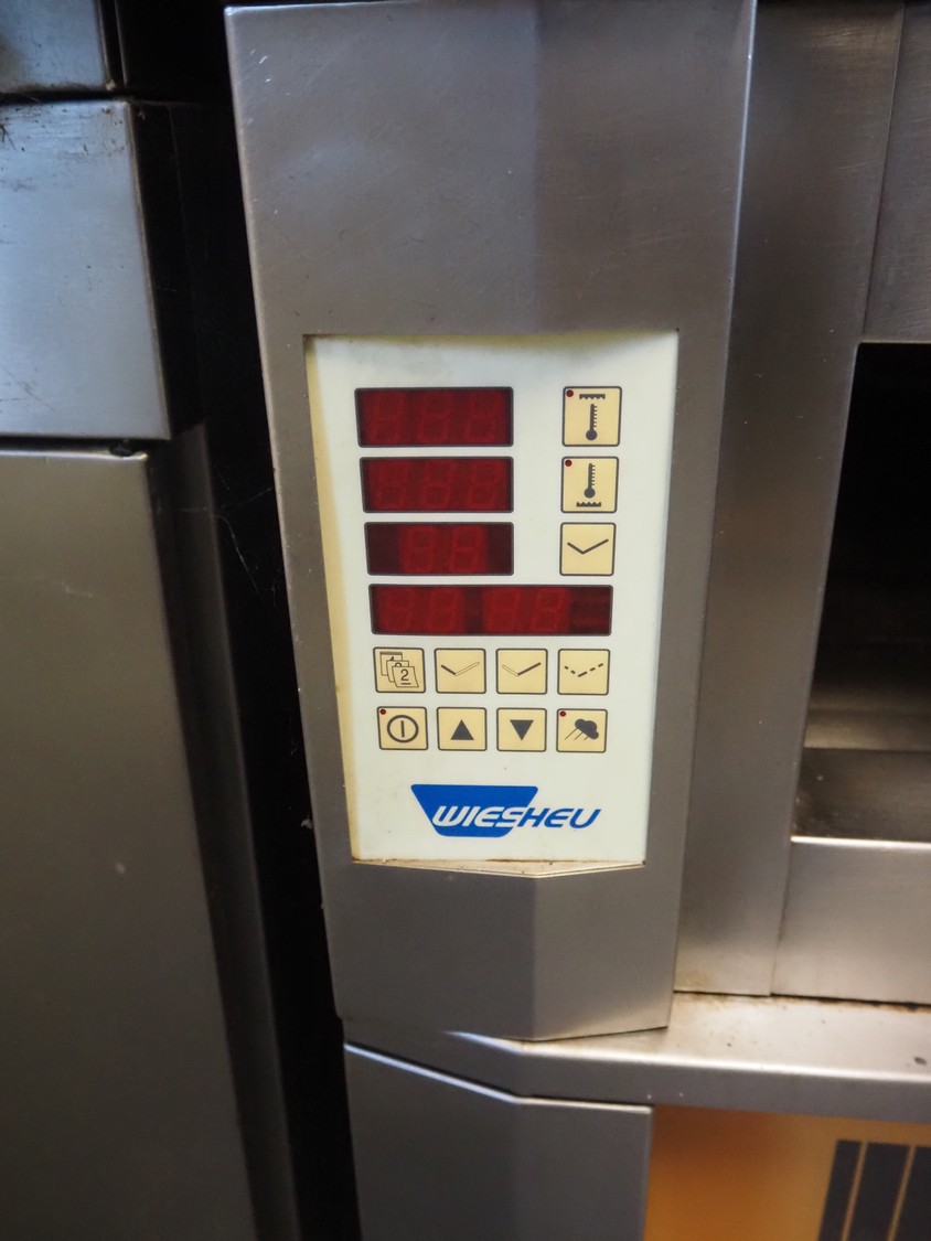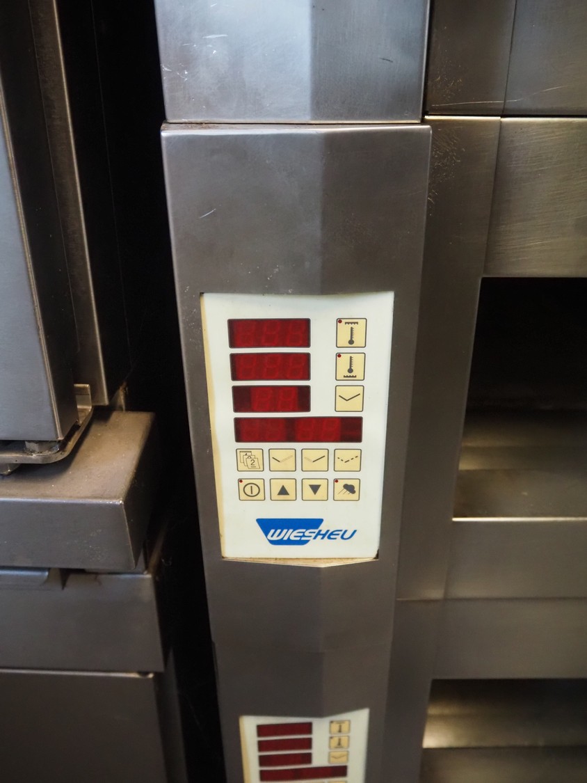 Wiesheu GmbH mobile 3-decks oven, with convection oven and oriifer, type: EBO 1-64R, number: 210944, year of construction: 2004-10, 400 V, 50 Hz, 1.2 kW, inside dimensions deck ovens: (3x) 610 mm x 580 mm x 160 mm, total dimensions: 940 mm x 960 mm x 2320 mm. Missing covers.