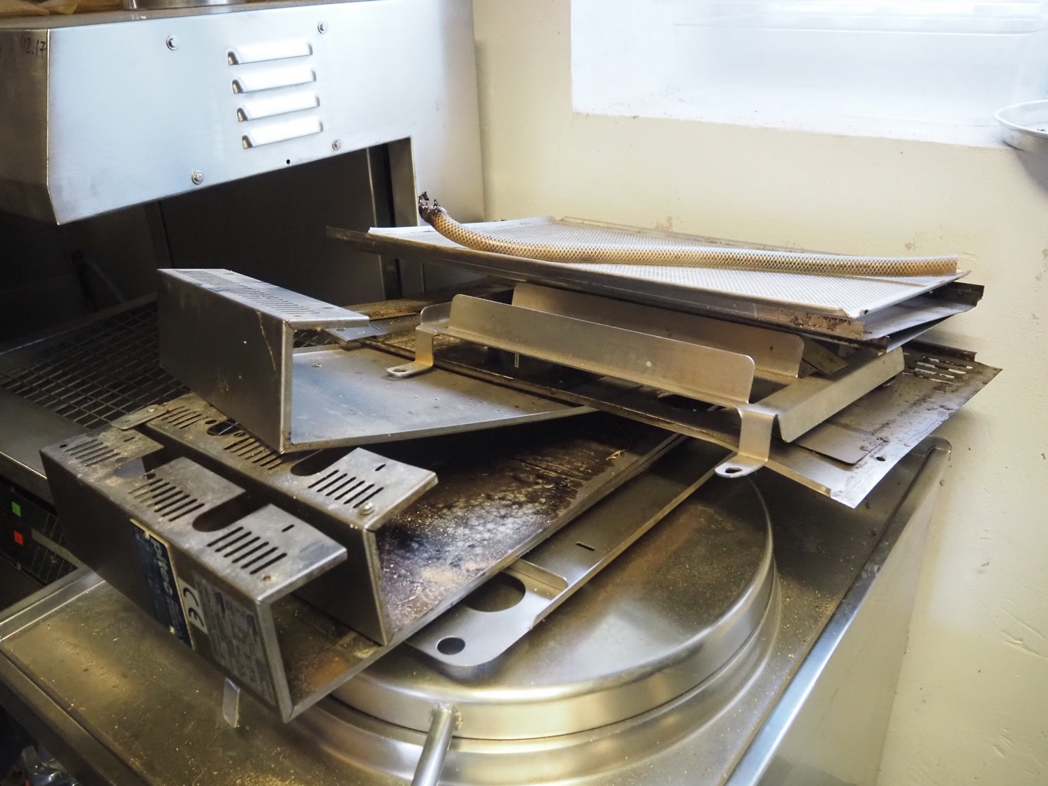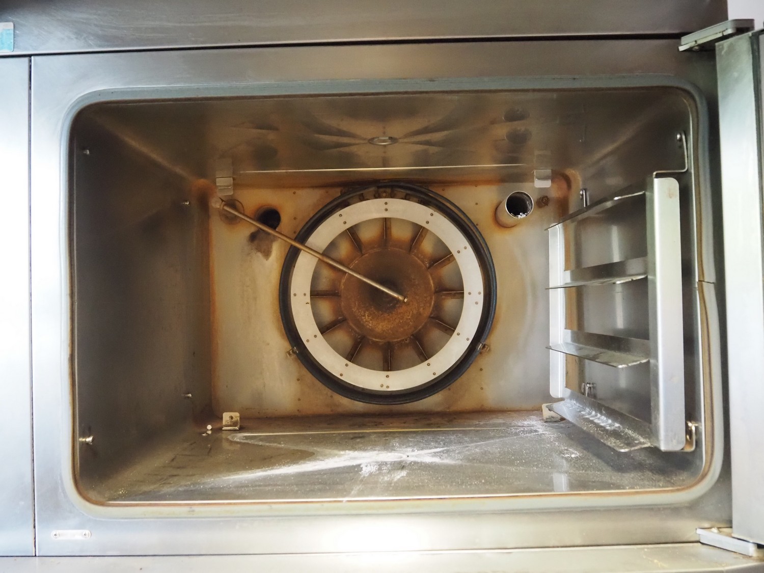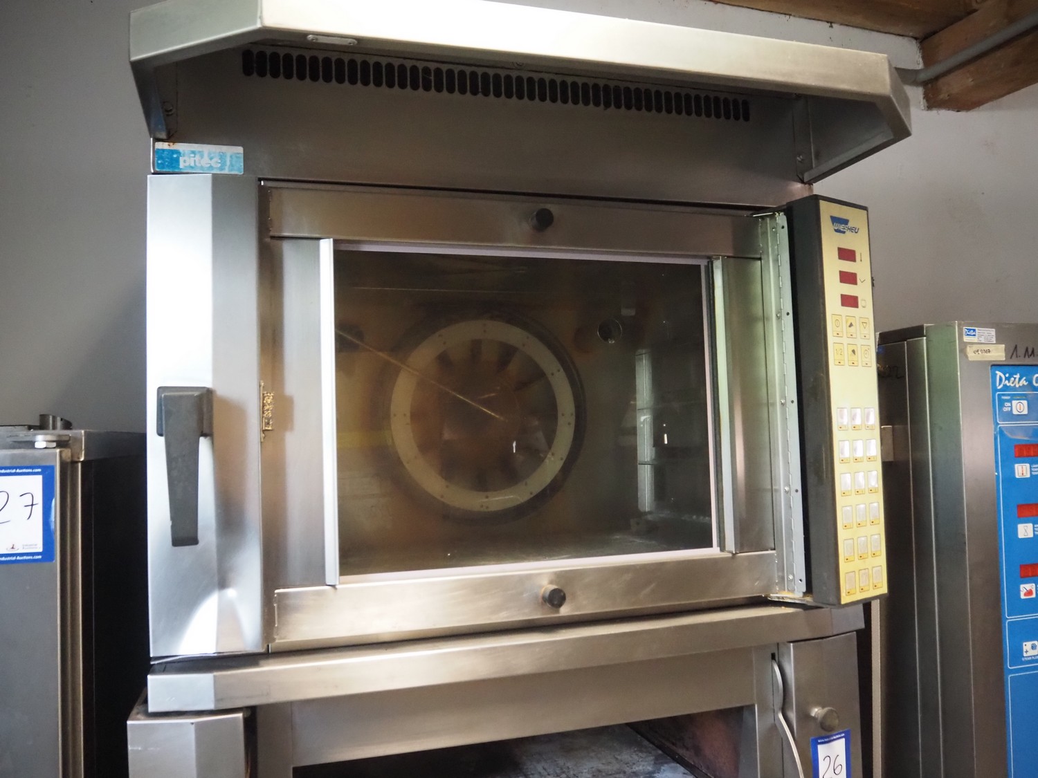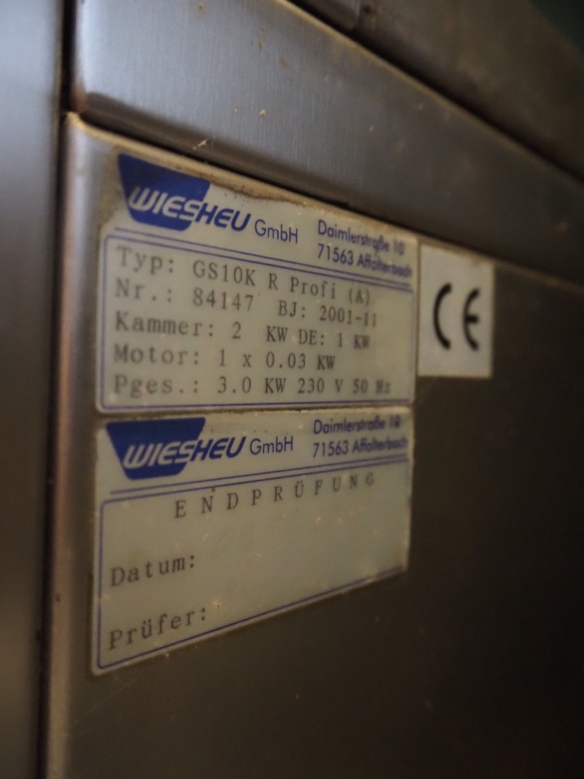Wiesheu GmbH mobile 3-decks oven, with convection oven and oriifer, type: EBO 1-64R, number: 210944, year of construction: 2004-10, 400 V, 50 Hz, 1.2 kW, inside dimensions deck ovens: (3x) 610 mm x 580 mm x 160 mm, total dimensions: 940 mm x 960 mm x 2320 mm. Missing covers.