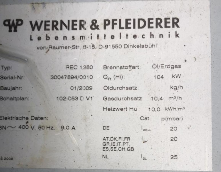 Werner & Pfleiderer rotary rack oven, type: REC 12.80, serial nr: 30047894/0010, year of construction: 01/2009, 104 kW, oil/gas heated, Elco burner, dimensions: 1750 mm x 2000 mm x 2600 mm.