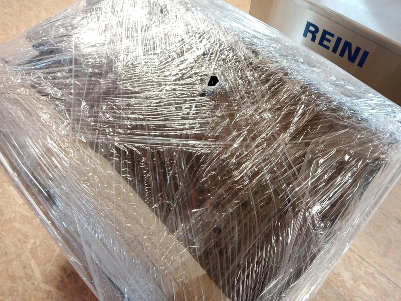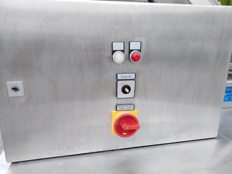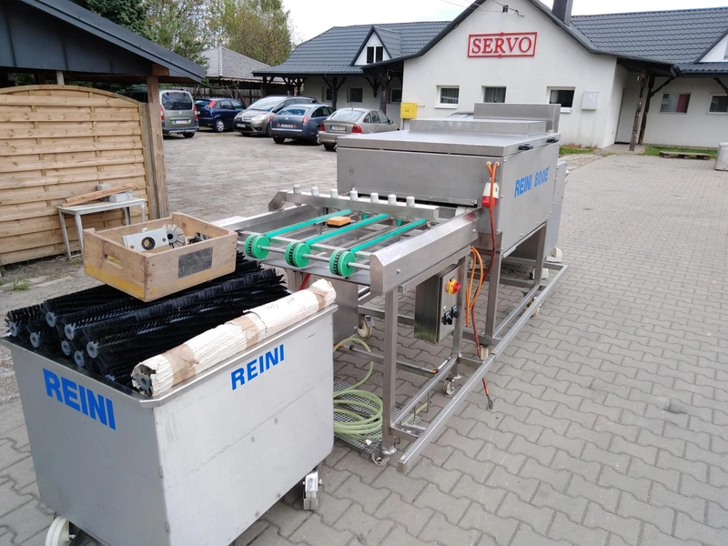 Reini mobile tray cleaning machine with oiling station, type: 800 E, number: 0398479, 380 V, 50 Hz, dimensions: 4000 mm x 1000 mm x 1700 mm. Including 2 s/s mobile tubs with spare parts.