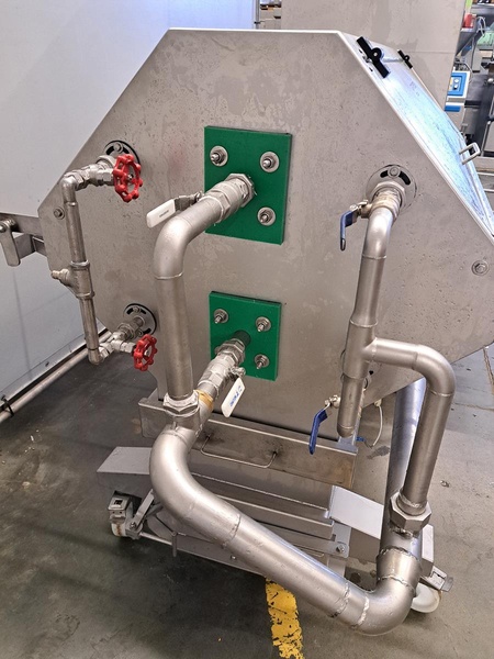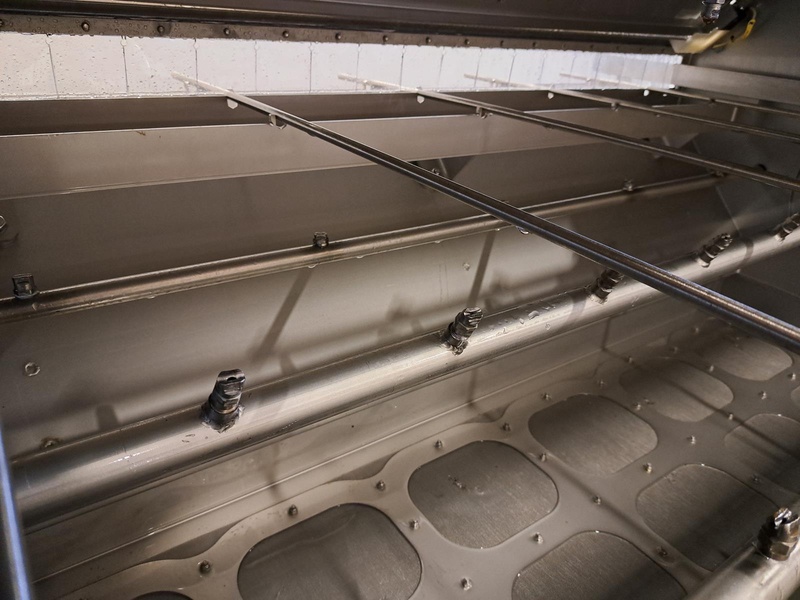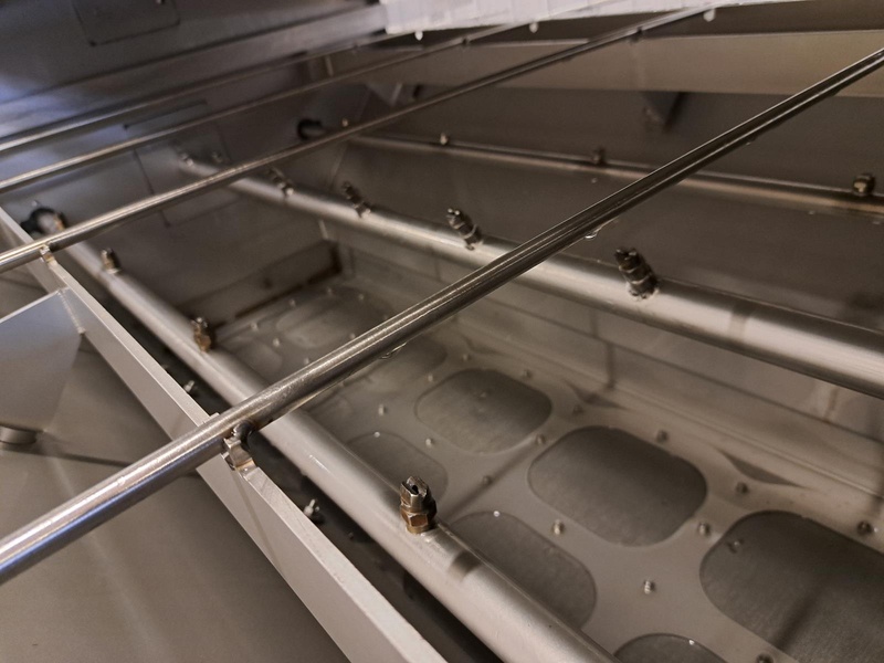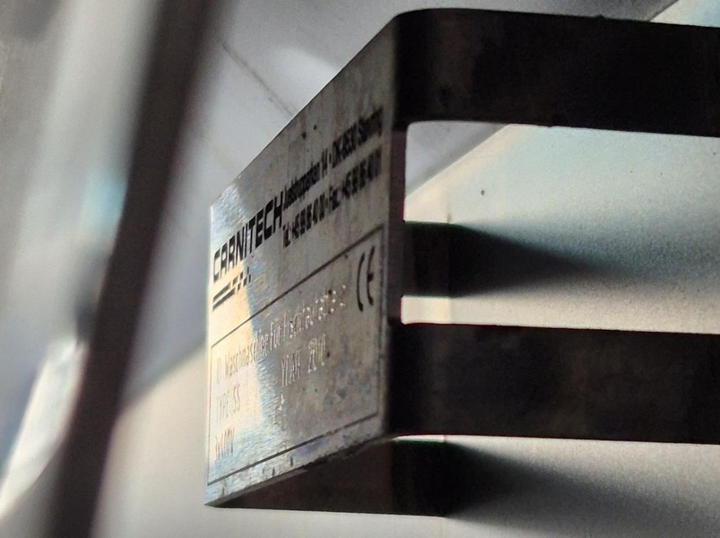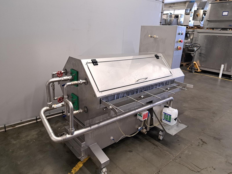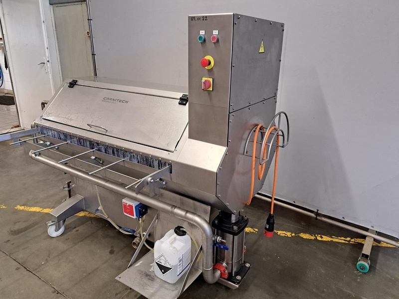 Carnitech mobile tray washer, type: SS, year of construction: 2010, 400 V, 3 Ph, 50 Hz, 2.2 kW, clearance: 1240 mm x 60 mm, total dimensions: 1950 mm x 1350 mm x 1650 mm. Overhauled in 2024.
