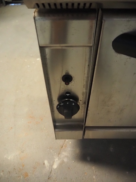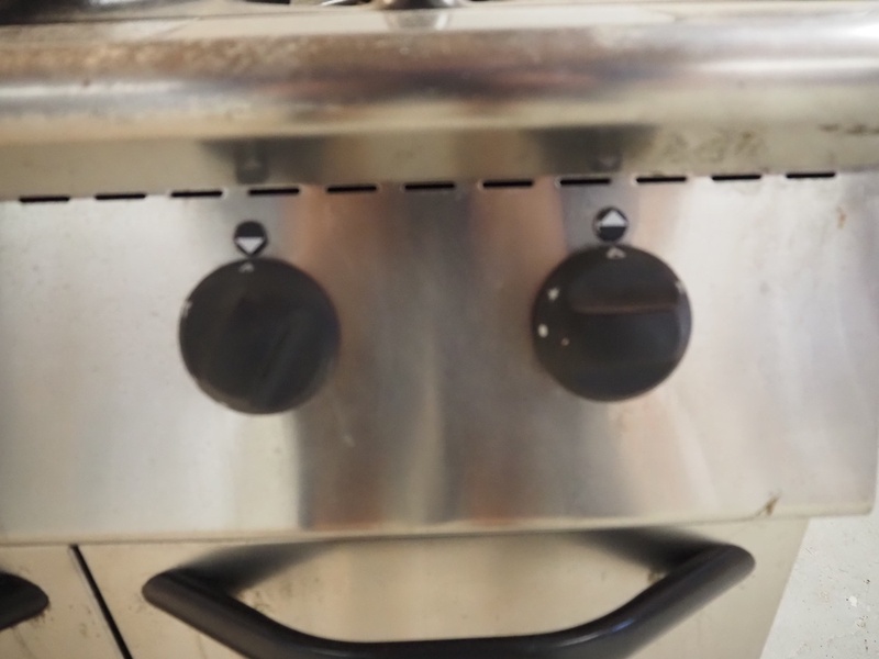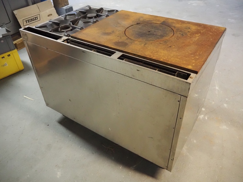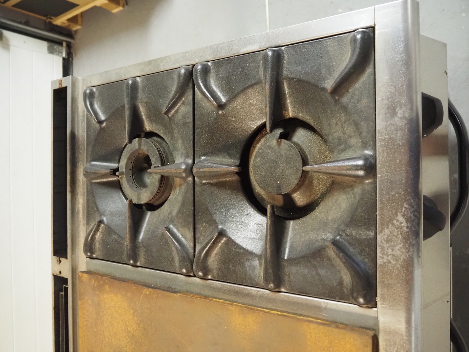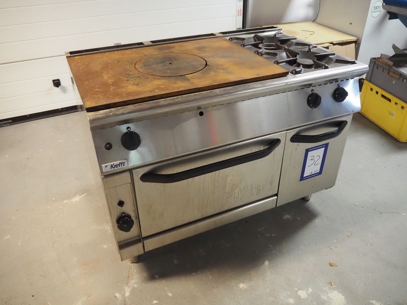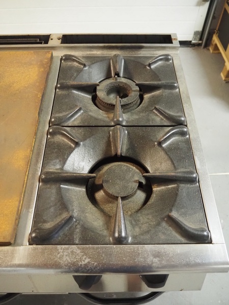 Kreft 3-burner stove with oven, dimensions griddle, 800 mm x 580 mm, floor dimensions oven: (3x) 530 mm x 650 mm, total dimensions: 1200 mm x 740 mm x 860 mm.