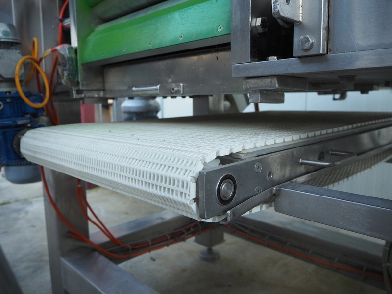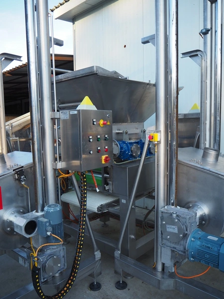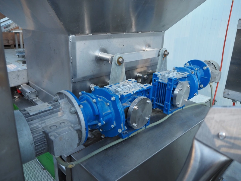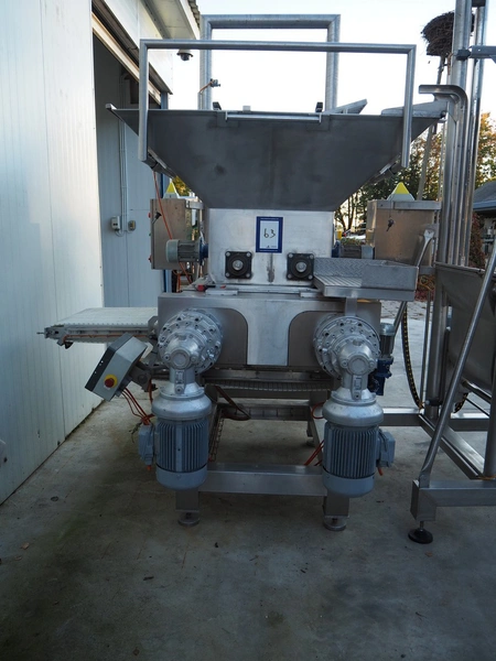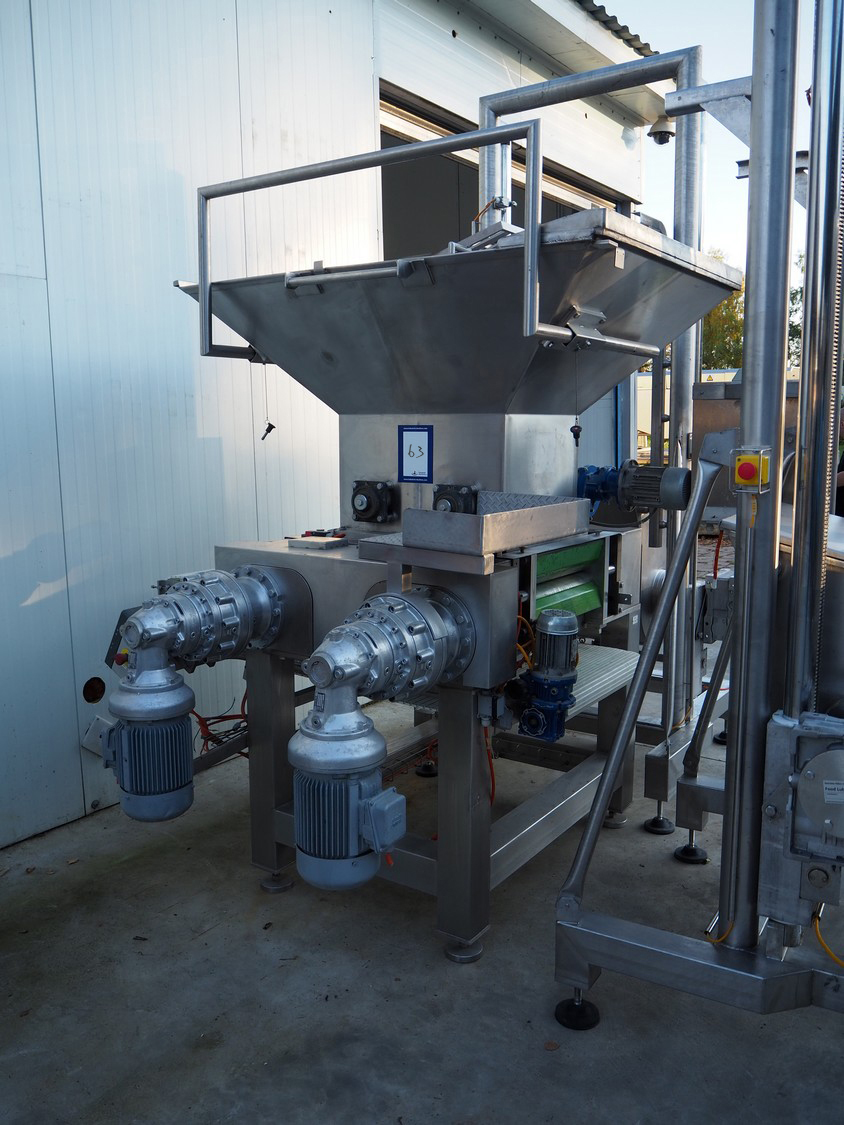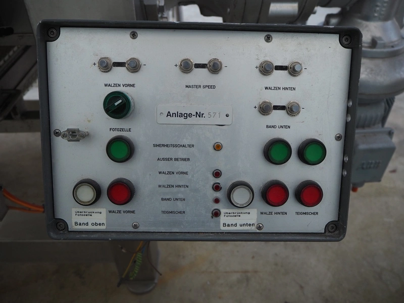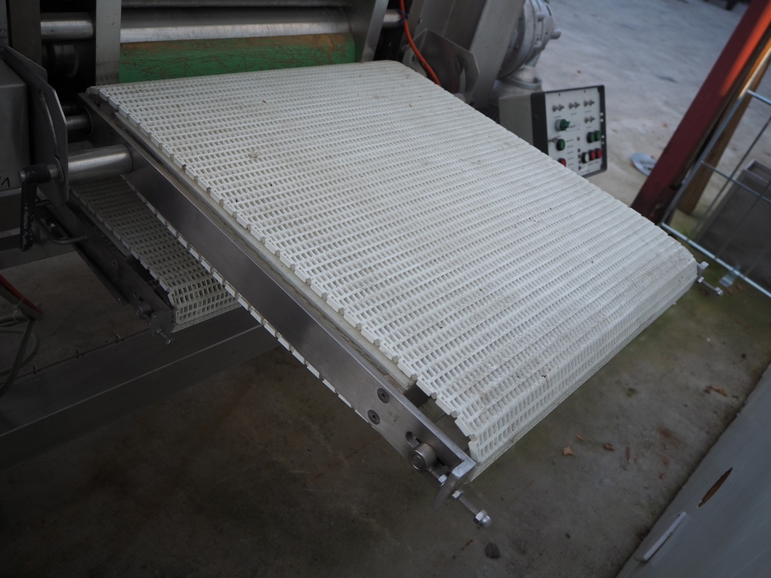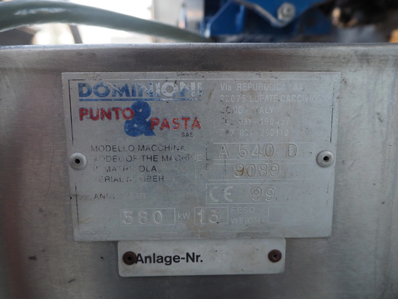 Dominioni pasta extruder, model: A540D, serial number: 9089, year of construction: 1999, 380 V, 13 kW, s/s rollers, roller width: 540 mm, plastic mesh belt, belt width: 660 mm, total dimensions: 1850 mm x 1750 mm x 2200 mm.