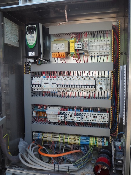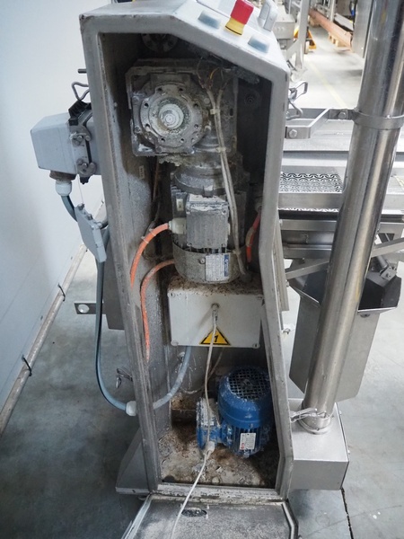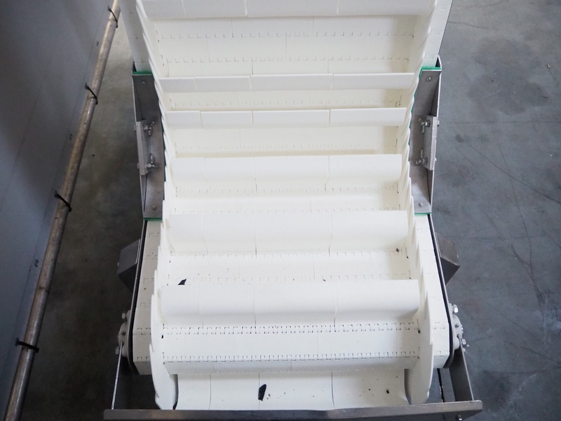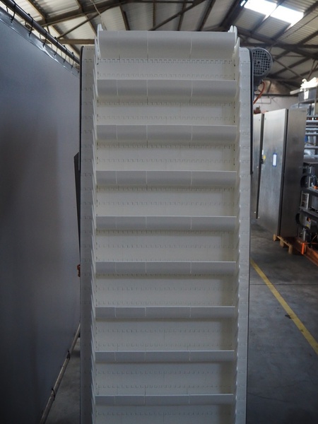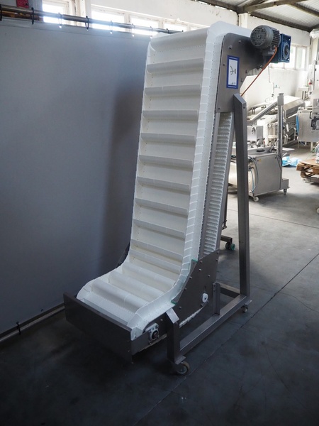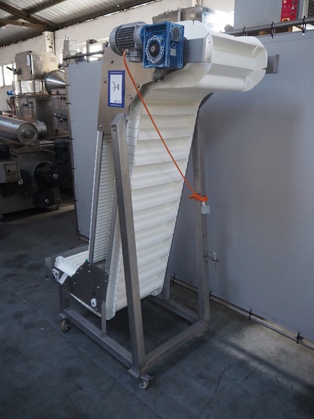 - SARP elevating belt, model: SNZ 600, serial number: IE0.01.G05E, year of construction: 2005, 400 V, 50 Hz, 0.37 kW, plastic belt and dividers, belt width: 480 mm, distance between dividers: 75 mm, divider height: 60 mm, elevating height: 2000 mm, total dimensions: 800 mm x 1350 mm x 2150 mm;