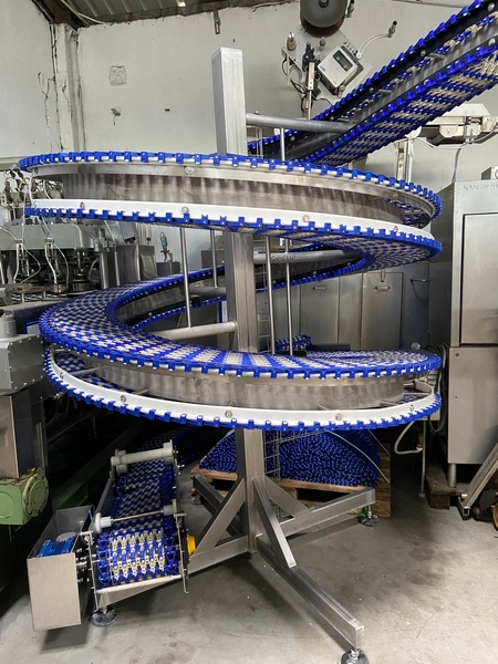 - BeltTrans spiral transport belt, s/s frame, plastic mesh belt, belt width: 300 mm, total dimensions: 2000 mm x 2600 mm x 2300 mm.