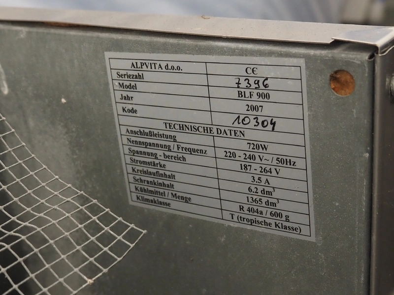 ALPVITA d.o.o. refrigerator, model: BLF 900, serial number; 7396, year of construction: 2007, 220-240 V, 50 Hz, 3.5 A, 720 W, volume: 1365 dm³, dimensions: 960 mm x 780 mm x 1990 mm.