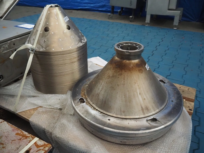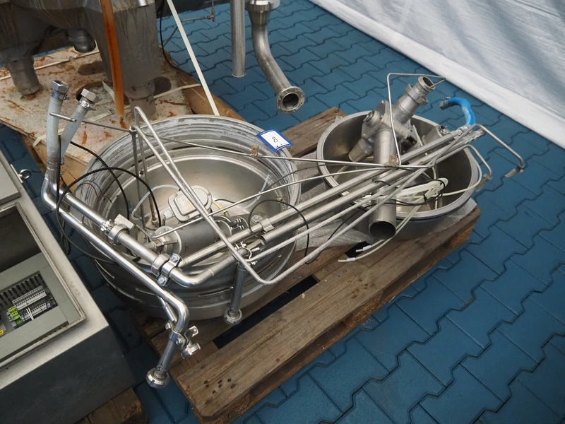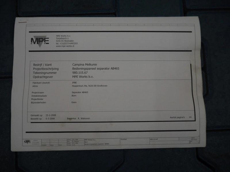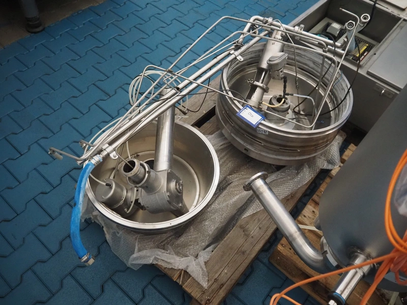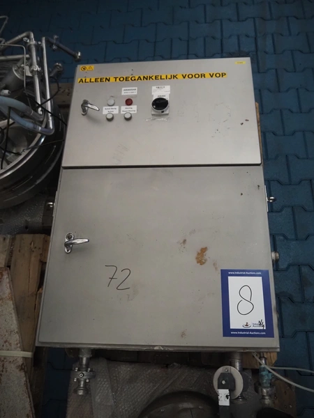 Alfa Laval centrifuge used as whey skimmer, machine number: 31829-02912, dimensions centrifuge: 1580 mm x 1200 mm x 1900, dimensions switch cabinet: 750 mm x 340 mm x 1100 mm, dimensions pallets: (2x) 1200 mm x 800 mm x 650 mm.