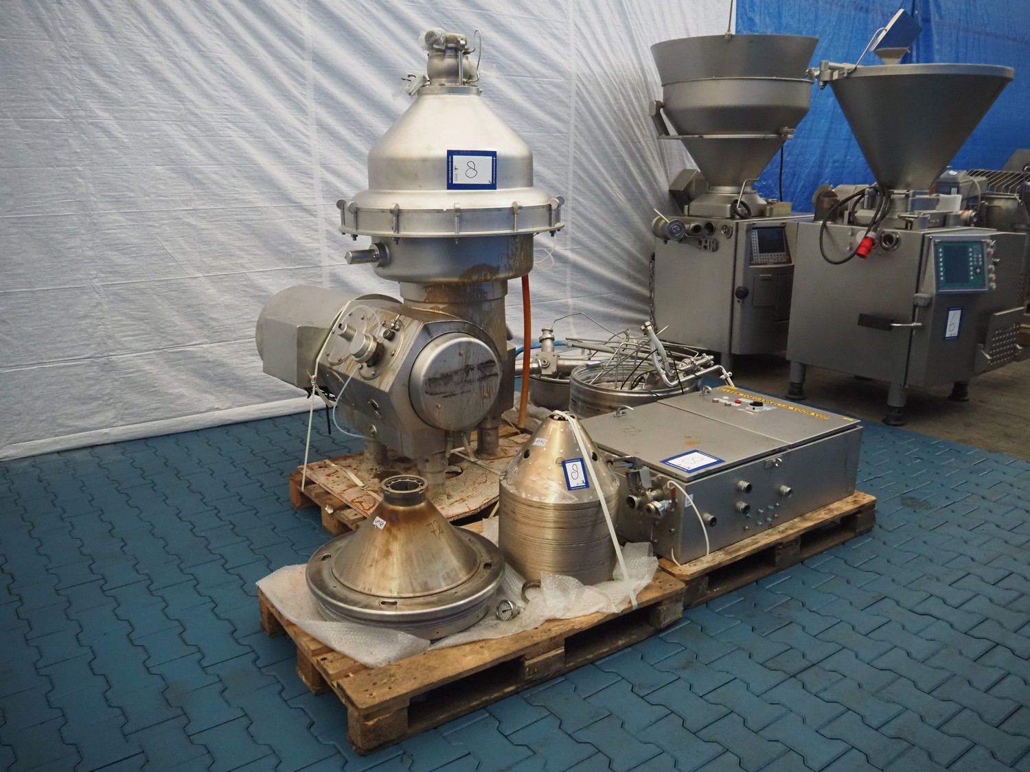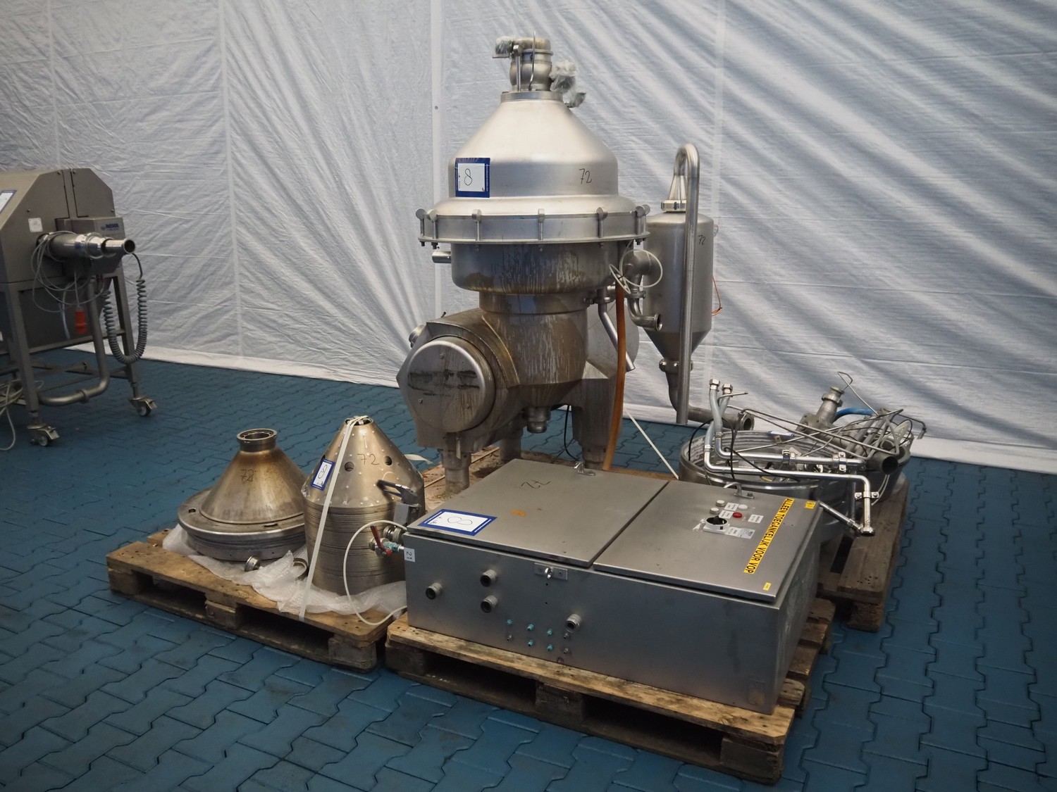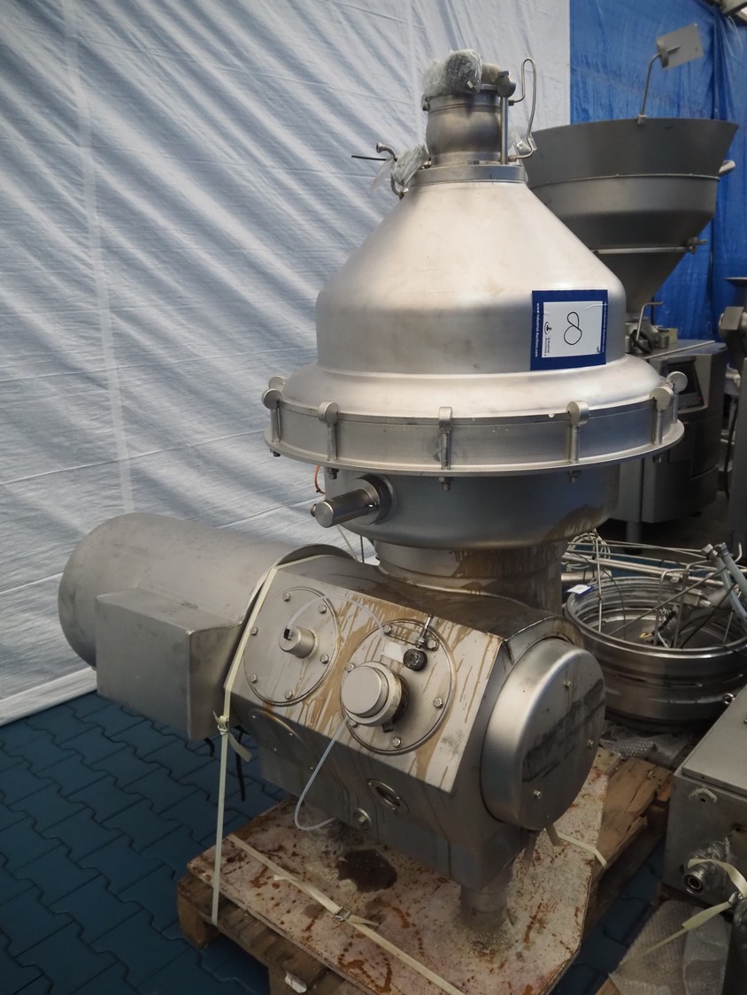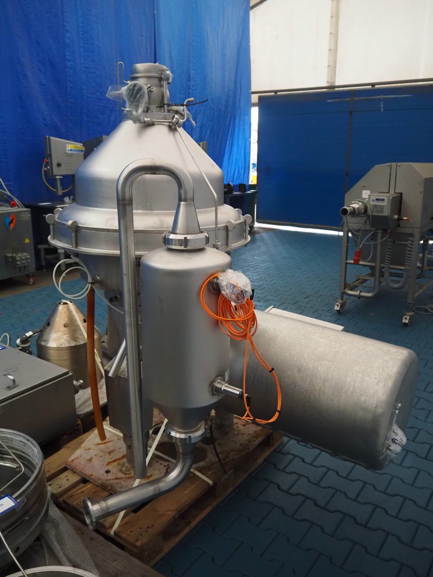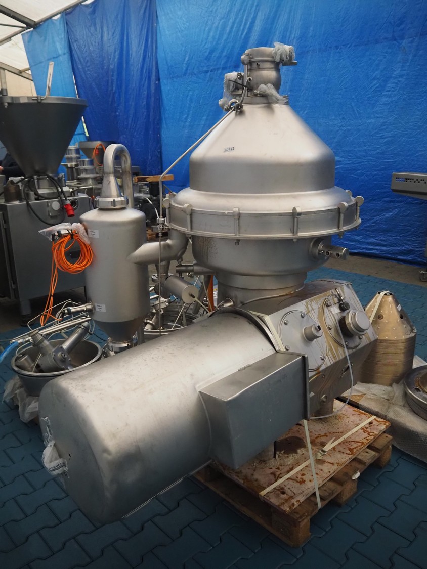Alfa Laval centrifuge used as whey skimmer, machine number: 31829-02912, dimensions centrifuge: 1580 mm x 1200 mm x 1900, dimensions switch cabinet: 750 mm x 340 mm x 1100 mm, dimensions pallets: (2x) 1200 mm x 800 mm x 650 mm.