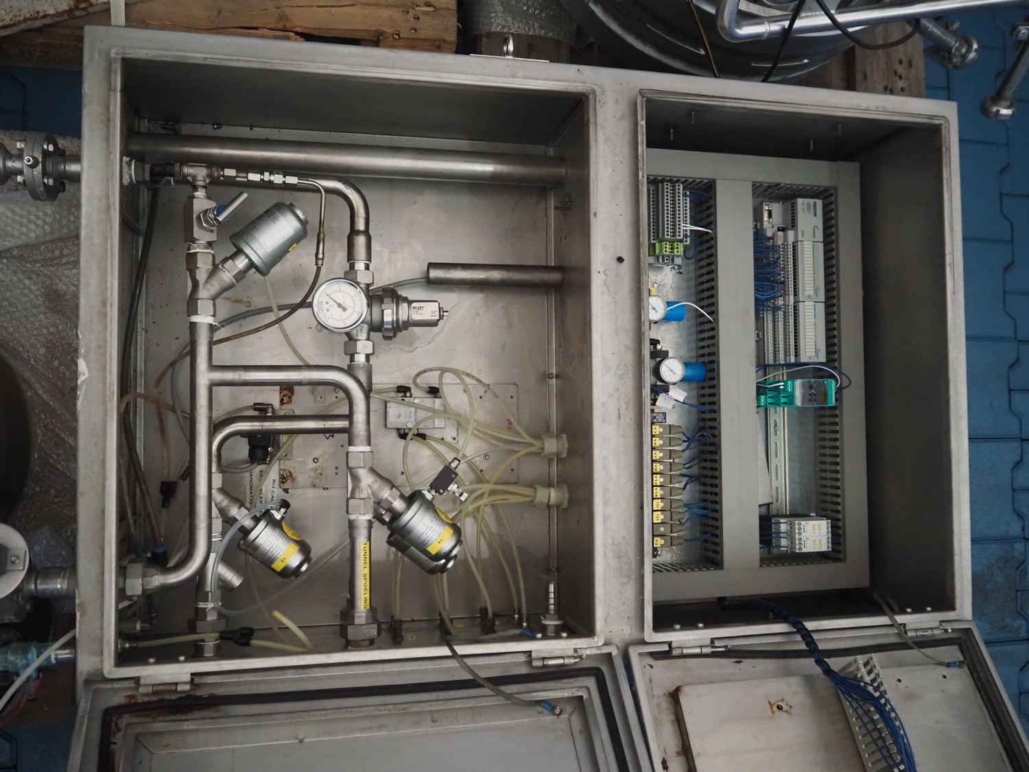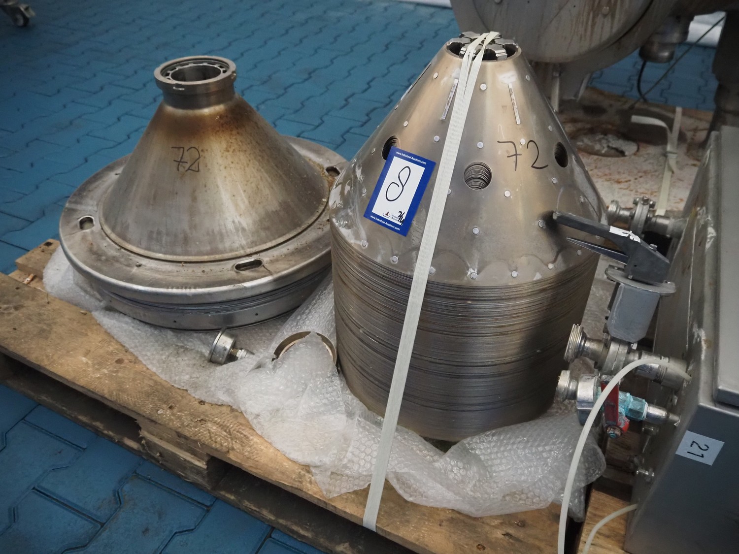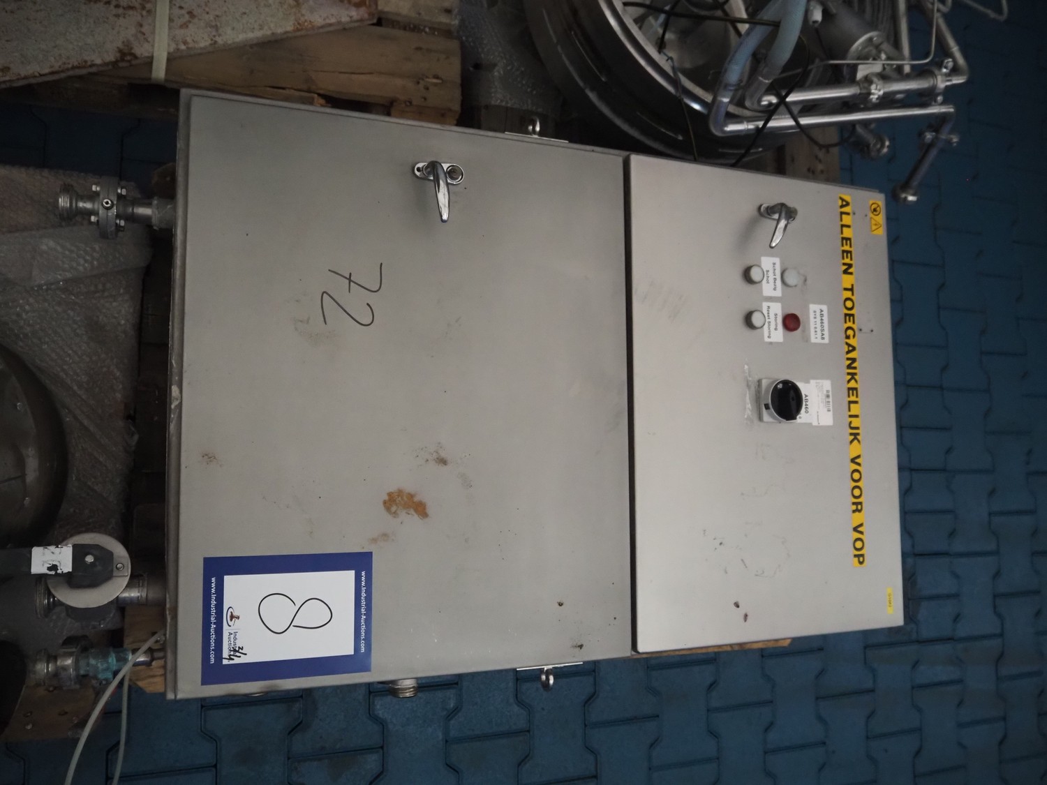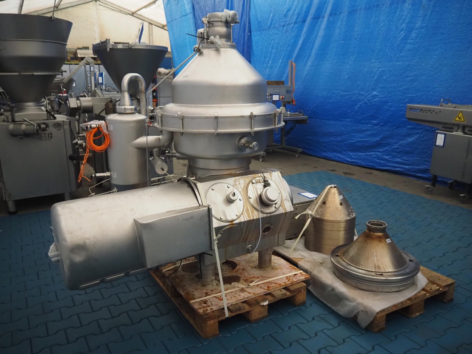 Alfa Laval centrifuge used as whey skimmer, machine number: 31829-02912, dimensions centrifuge: 1580 mm x 1200 mm x 1900, dimensions switch cabinet: 750 mm x 340 mm x 1100 mm, dimensions pallets: (2x) 1200 mm x 800 mm x 650 mm.
