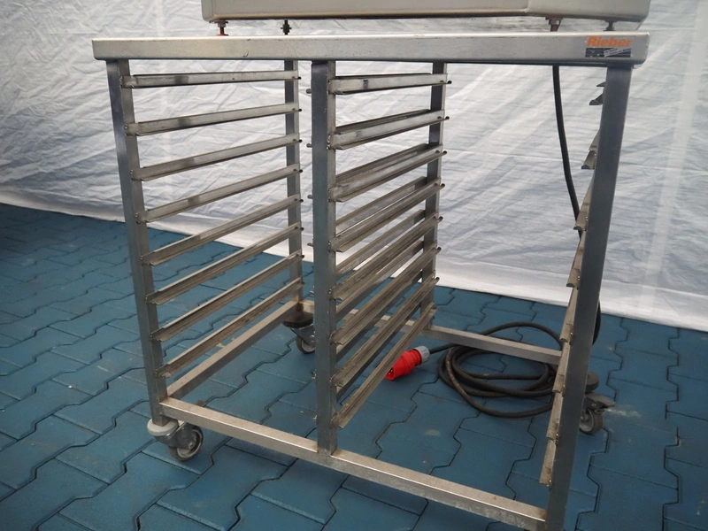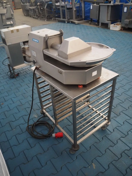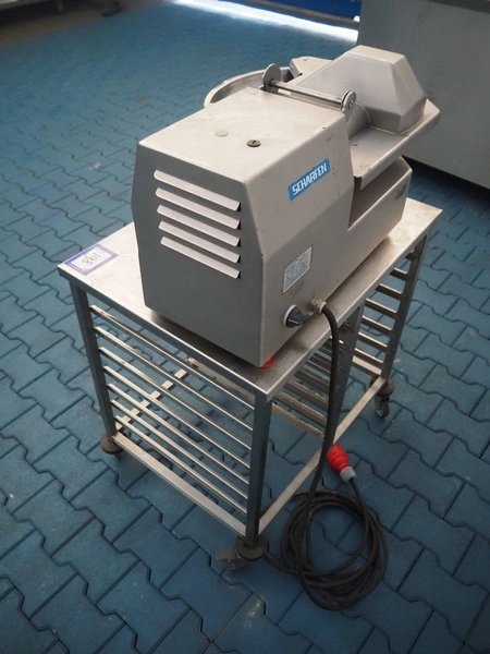 Scharfen cutter on s/s trolley, type: TC11, number: 2143033, year of construction: 2014, 400 V, 3.6/5.1 A, 1400/1800 W, s/s bowl, volume: 11 liter, dimensions cutter: 850 mm x 500 mm x 580 mm, dimensions trolley: 770 mm x 580 mm x 800 mm.