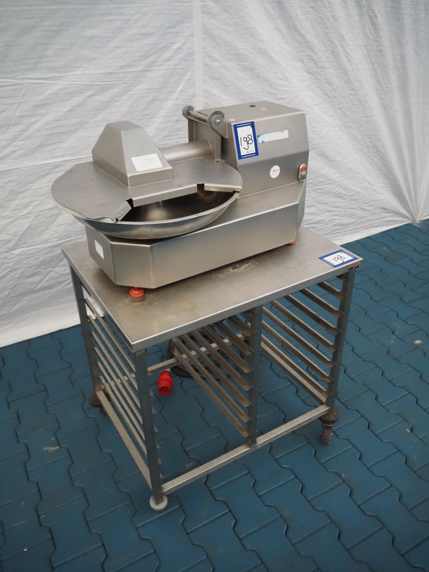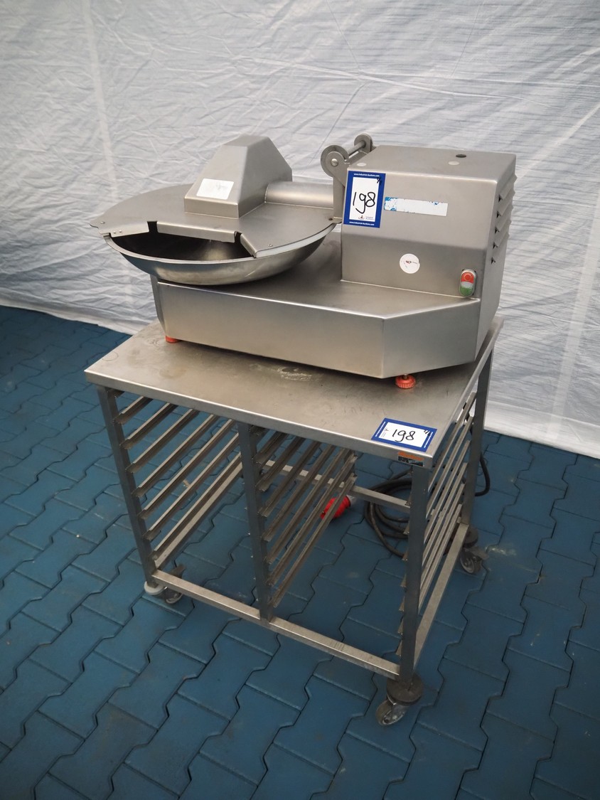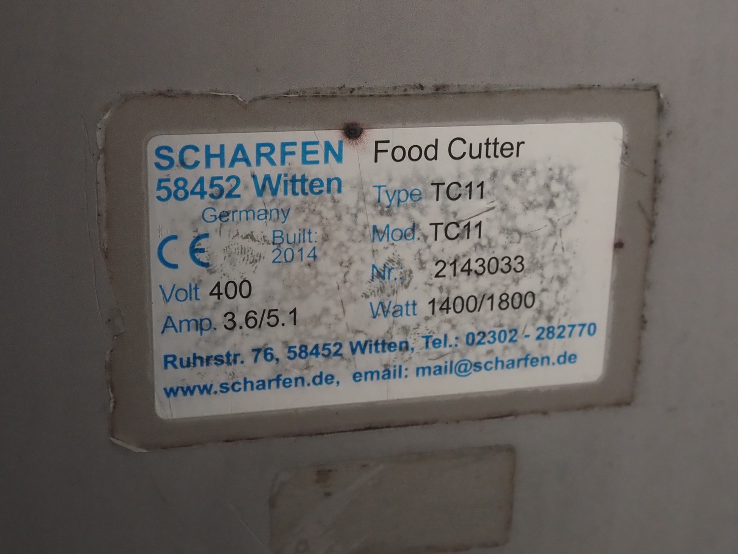 Scharfen cutter on s/s trolley, type: TC11, number: 2143033, year of construction: 2014, 400 V, 3.6/5.1 A, 1400/1800 W, s/s bowl, volume: 11 liter, dimensions cutter: 850 mm x 500 mm x 580 mm, dimensions trolley: 770 mm x 580 mm x 800 mm.