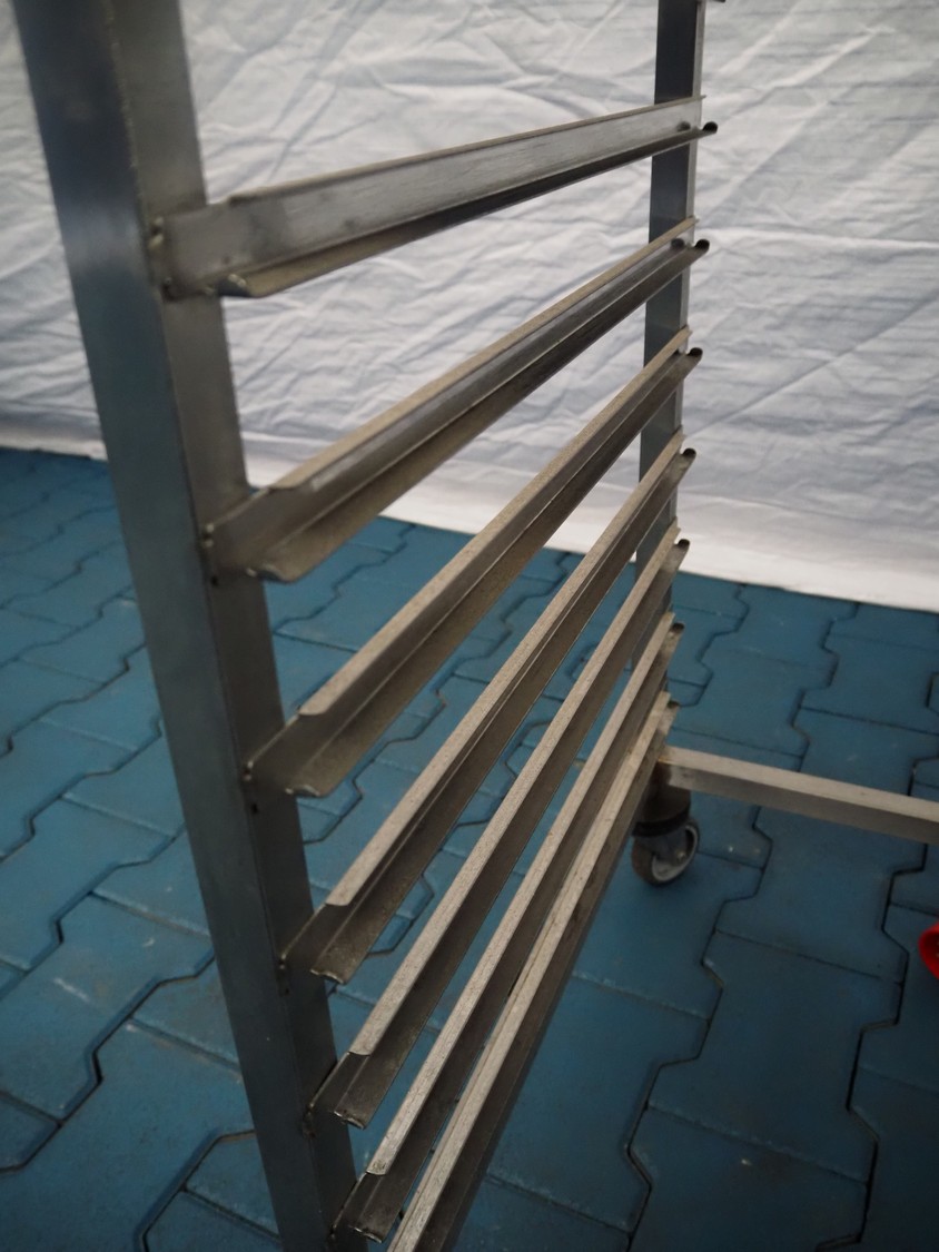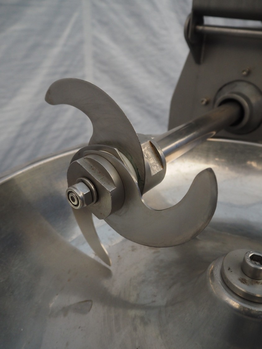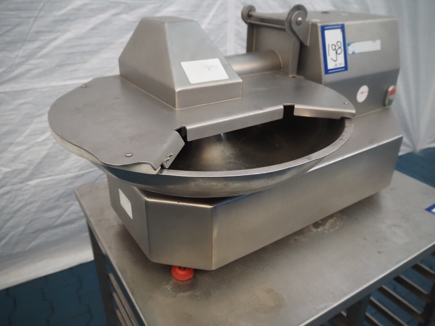 Scharfen cutter on s/s trolley, type: TC11, number: 2143033, year of construction: 2014, 400 V, 3.6/5.1 A, 1400/1800 W, s/s bowl, volume: 11 liter, dimensions cutter: 850 mm x 500 mm x 580 mm, dimensions trolley: 770 mm x 580 mm x 800 mm.