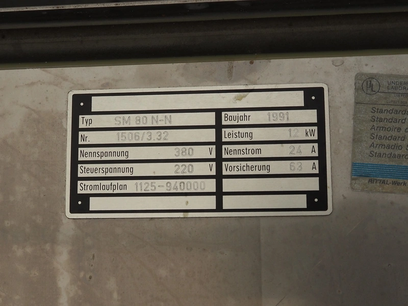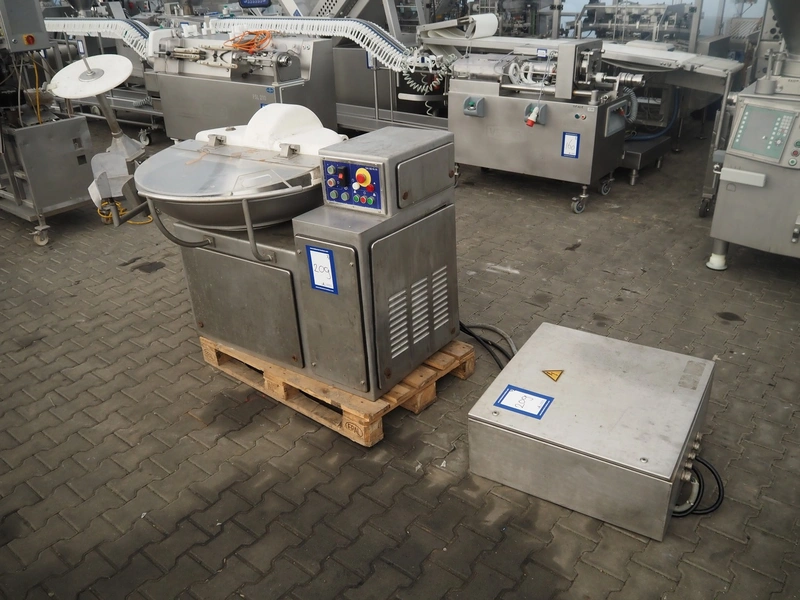Nematec cutter with ejector, type: SM80-N-N, number: 021, year of construction: 1994, 400 V, 3 Ph, 50 Hz, 24/63 A, 12 kW, s/s bowl, volume: 80 liter, dimensions: 1770 mm x 1300 mm x 1520 mm, dimensions swithc cabinet: 800 mm x 800 mm x 300 mm.