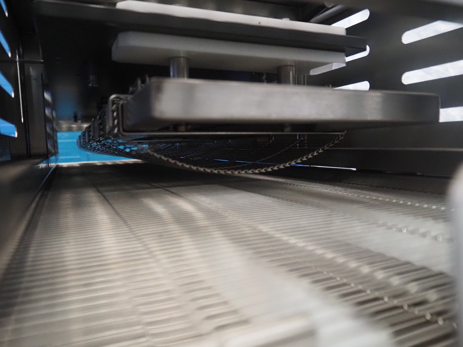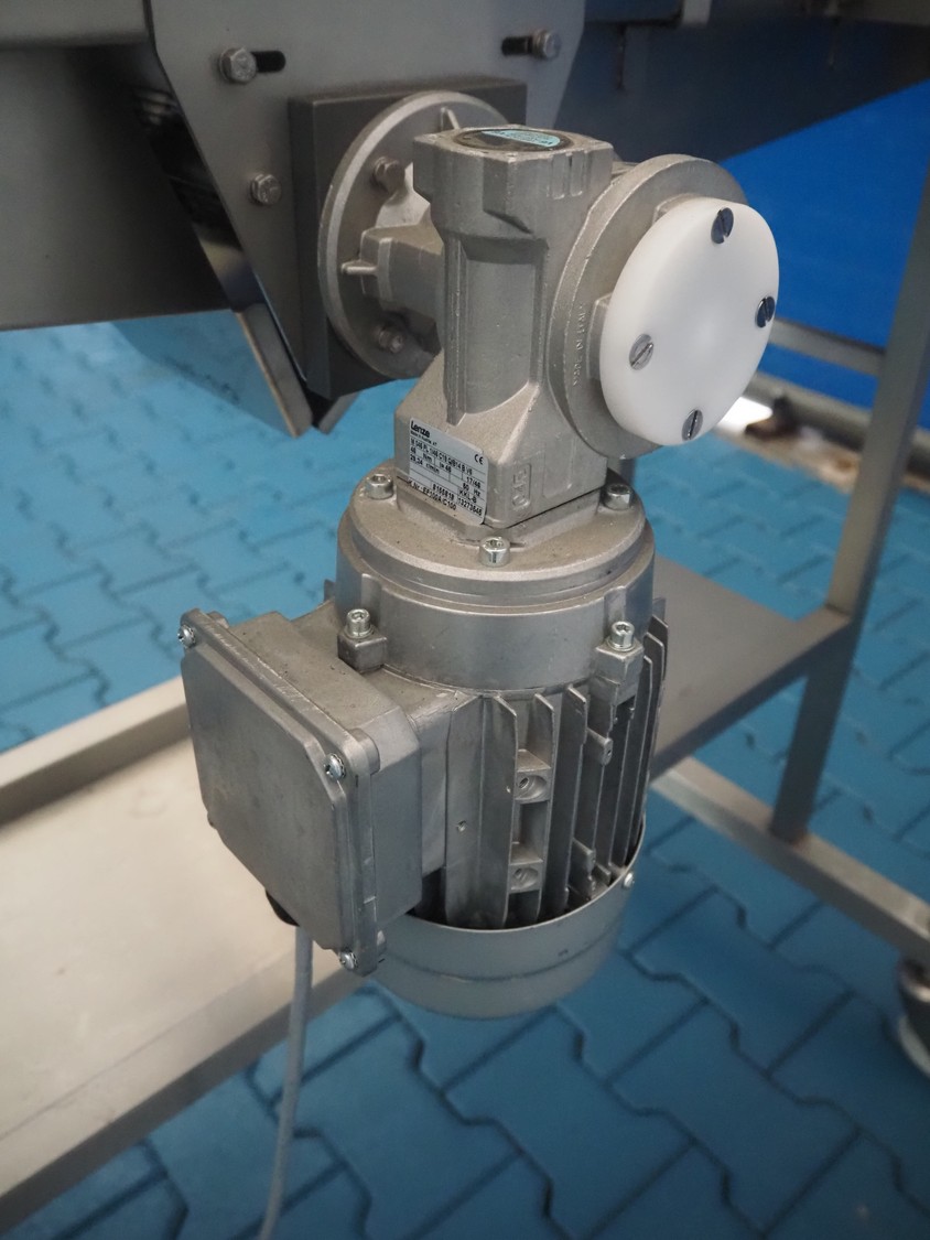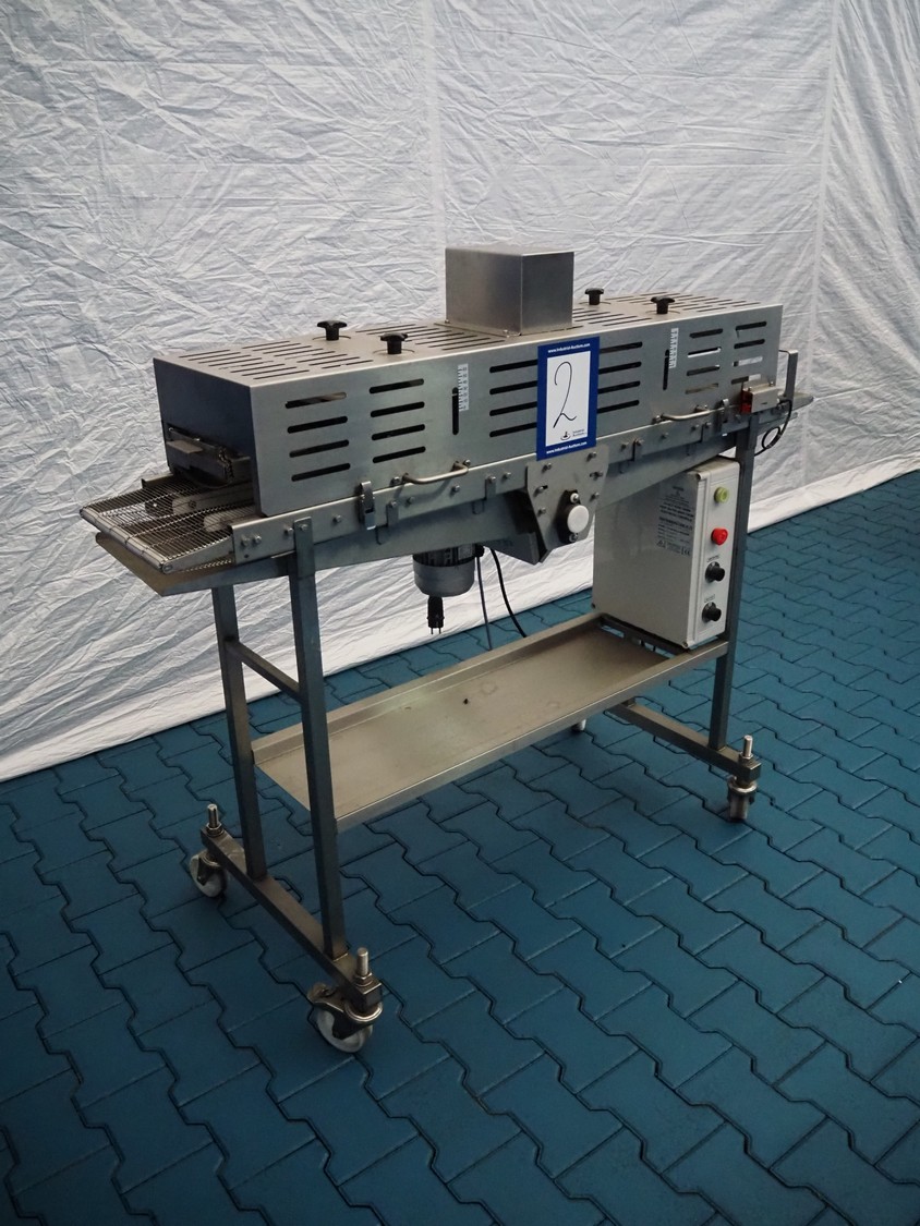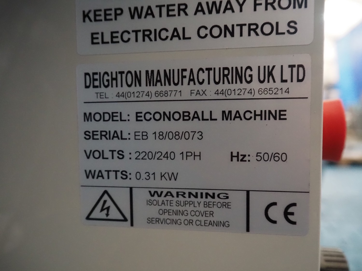 Deighton Manufacturing UK LTD mobile meatball forming machine, model: ECONOBALL MACHINE, serial number: EB 18/08/073, 220/240 V, 1 Ph, 50/60 Hz, 0.31 kW, s/s mesh belt, belt width: 280 mm, total dimensions: 1550 mm x 640 mm x 1170 mm.